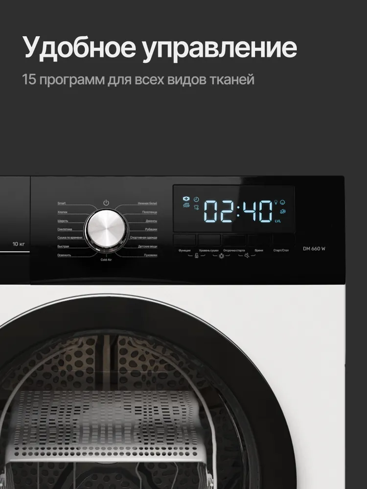 В комплекте с сушильной машиной идут корзина и полка для сушки изделий из шерсти. Устройство оснащено дисплеем, а его барабан выполнен из нержавеющей стали. Габариты сушильной машины составляют 595 x 665 x 850 мм, вес — 50,7 кг.
