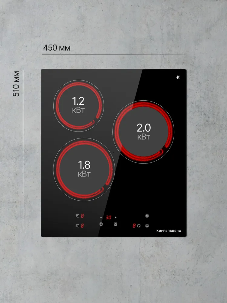 Электрическая варочная панель Kuppersberg ECO 400 — это компактная модель шириной 45 см, которая идеально подойдёт для кухни с ограниченным пространством. Четыре конфорки Hi-Light: передняя левая — 1,8 кВт, задняя левая — 1,2 кВт, средняя — двухконтурная (1,0/2,0 кВт), диаметр до 200 мм. Рабочая поверхность выполнена из стеклокерамики KANGER, которая легко очищается и стойка к высоким температурам. Сенсорное управление и красный LED-дисплей обеспечивают простоту и точность настройки. Мощность подключения — 5 кВт. Панель сочетает в себе высокую производительность и эргономику. Kuppersberg ECO 400 — надёжное и удобное решение для вашей кухни.