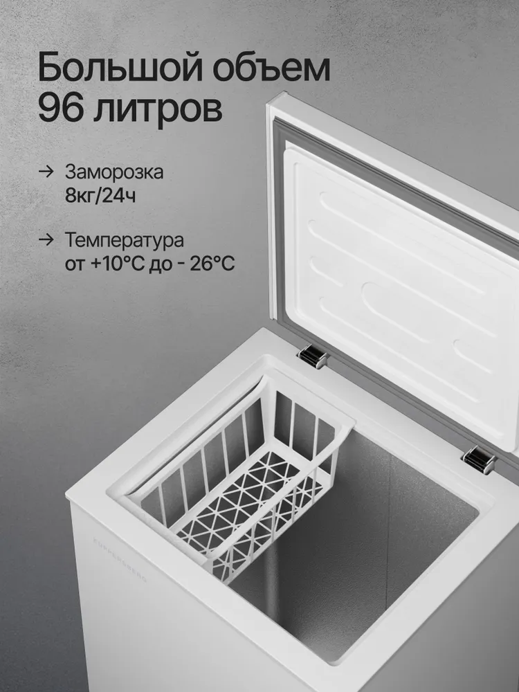 Морозильник отдельностоящий (Ларь) Kuppersberg FLCF 100 W идеальное решение для хранения замороженных продуктов. С просторным объемом 100 литров он обеспечивает достаточно места для разнообразной замороженной пищи. Энергоэффективный класс A+ поможет сэкономить электроэнергию, не перегружая семейный бюджет. Стильный белый дизайн морозильника Kuppersberg FLCF 100 W подойдет к любому интерьеру кухни. Благодаря технологии низкого уровня шума, он работает бесшумно, не мешая вашему покое. Защита от перегрева и автоматическое размораживание делают эксплуатацию морозильника максимально удобной.