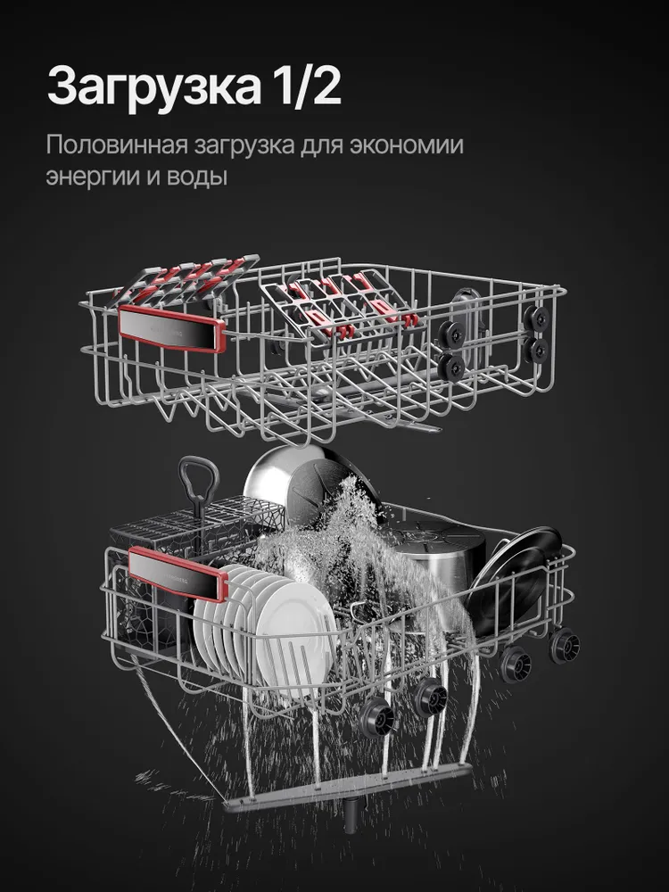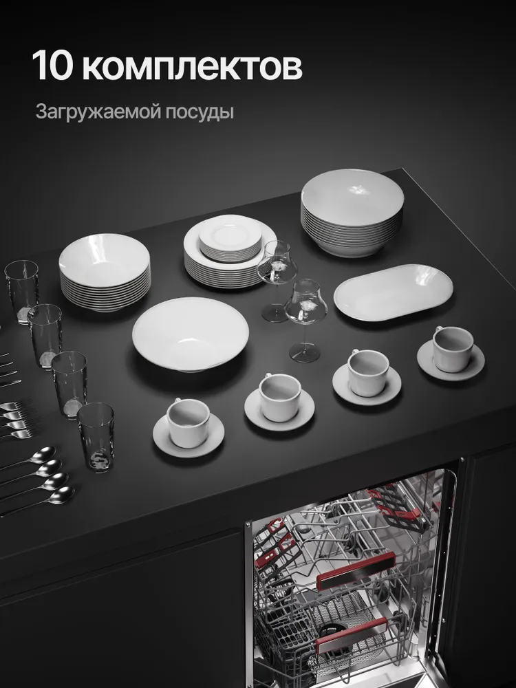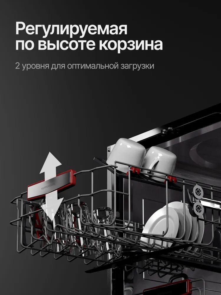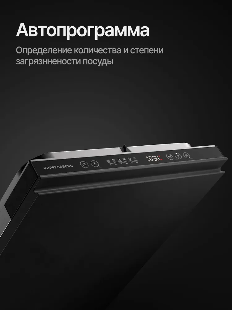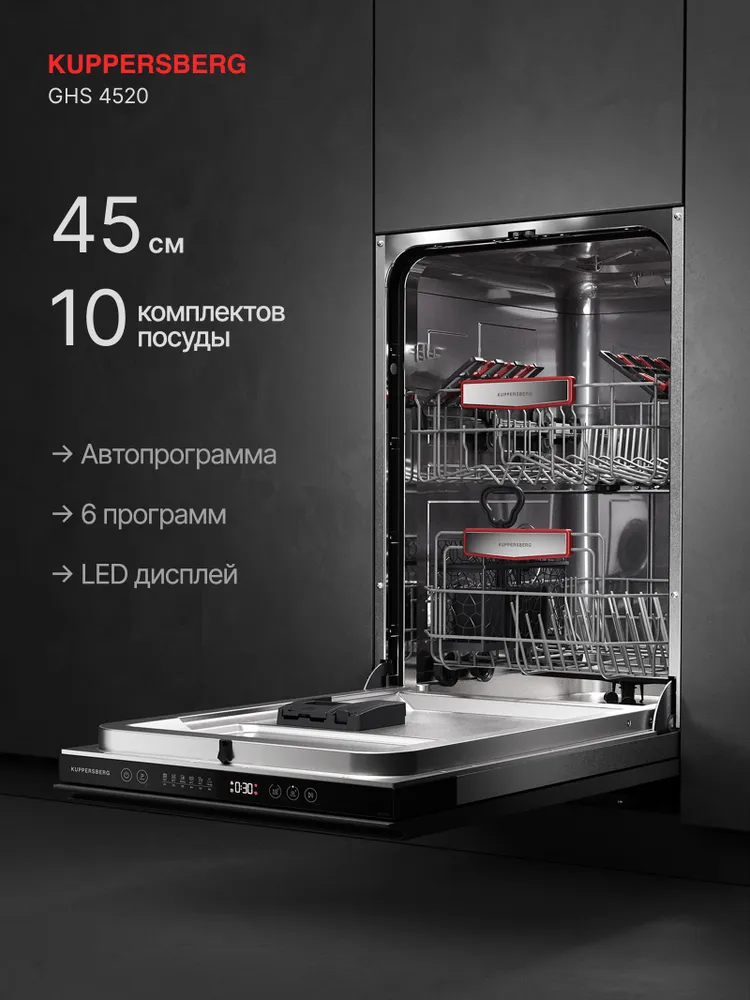 Kuppersberg GHS 4520 — компактная полностью встраиваемая посудомоечная машина шириной 45 см, рассчитанная на 10 комплектов посуды. Идеальный выбор для небольших кухонь, где важны экономия пространства и высокая эффективность мойки. Модель получила высшие классы энергоэффективности, мойки и сушки, оснащена 6 основными программами и работает тихо — всего 49 дБ. Удобное сенсорное управление, белый LED-дисплей, отложенный старт до 24 часов и индикаторы отсутствия соли и ополаскивателя делают эксплуатацию максимально простой. Внутри — рабочая камера из нержавеющей стали, три корзины (включая вертикальную корзину для столовых приборов), регулируемая по высоте средняя корзина (2 положения), складные держатели для тарелок и полка для чашек. Два разбрызгивателя и конденсационная сушка с возможностью половинной загрузки гарантируют отличный результат при любом объёме посуды. Дополнительно предусмотрена защита от детей, самодиагностика неисправностей и полная комплектация для встраивания. Kuppersberg GHS 4520 — надёжное и функциональное решение для тех, кто ценит немецкое качество по доступной цене.