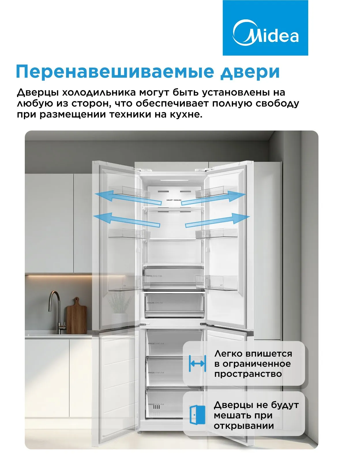 Перевешиваемые двери с нулевым зазором позволяют интегрировать холодильник в любое кухонное пространство.