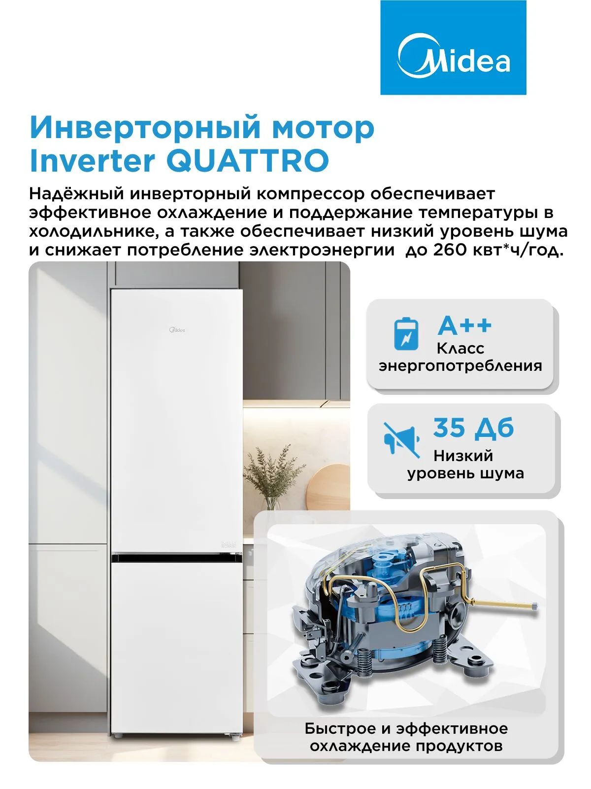Инверторный компрессор снижает уровень шума до 35 дБ и экономит электроэнергию благодаря классу A++.