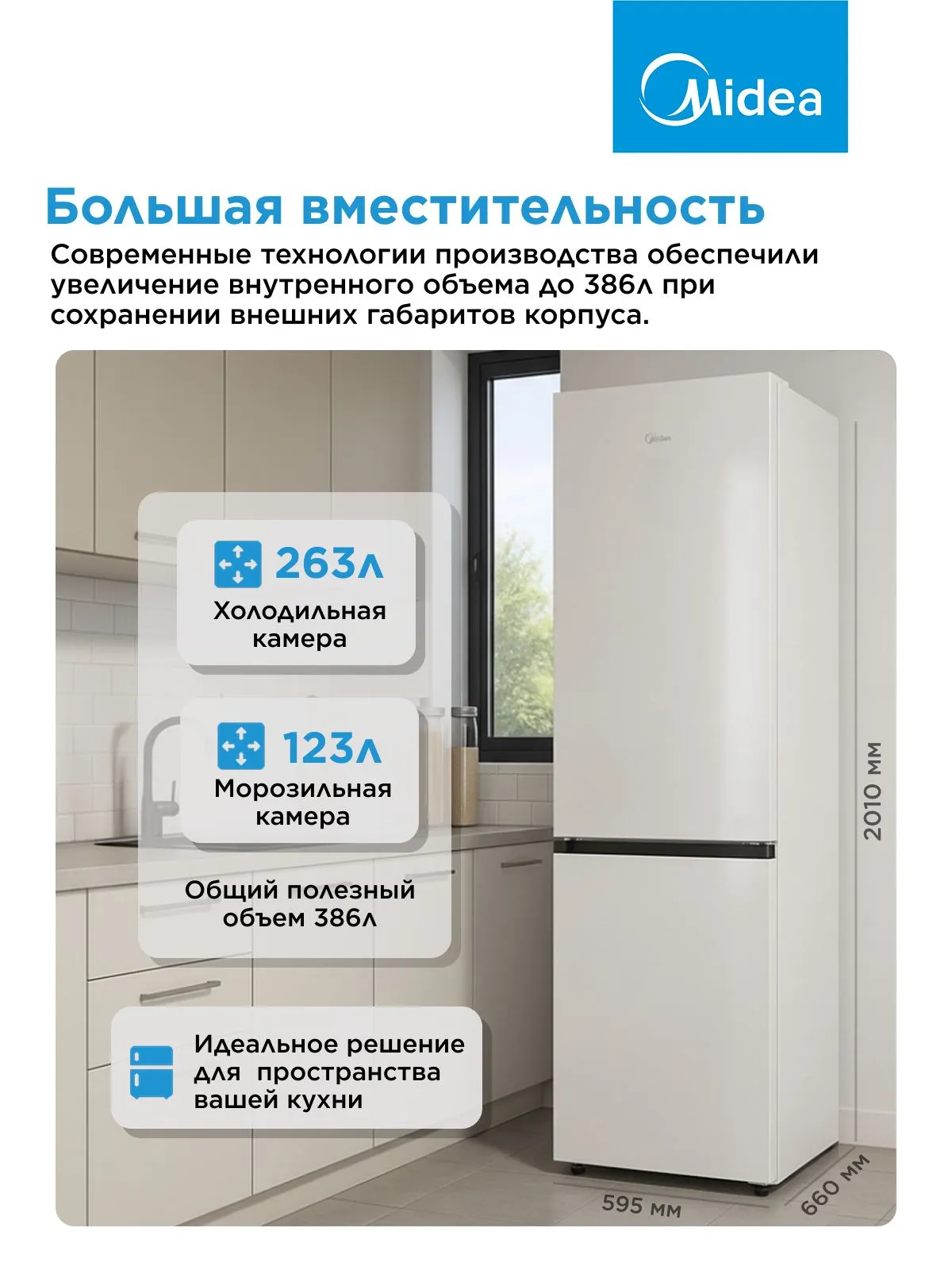 Полезный объем холодильной камеры — 263 литра, морозильной — 123 литра. Это удобно для распределения продуктов.