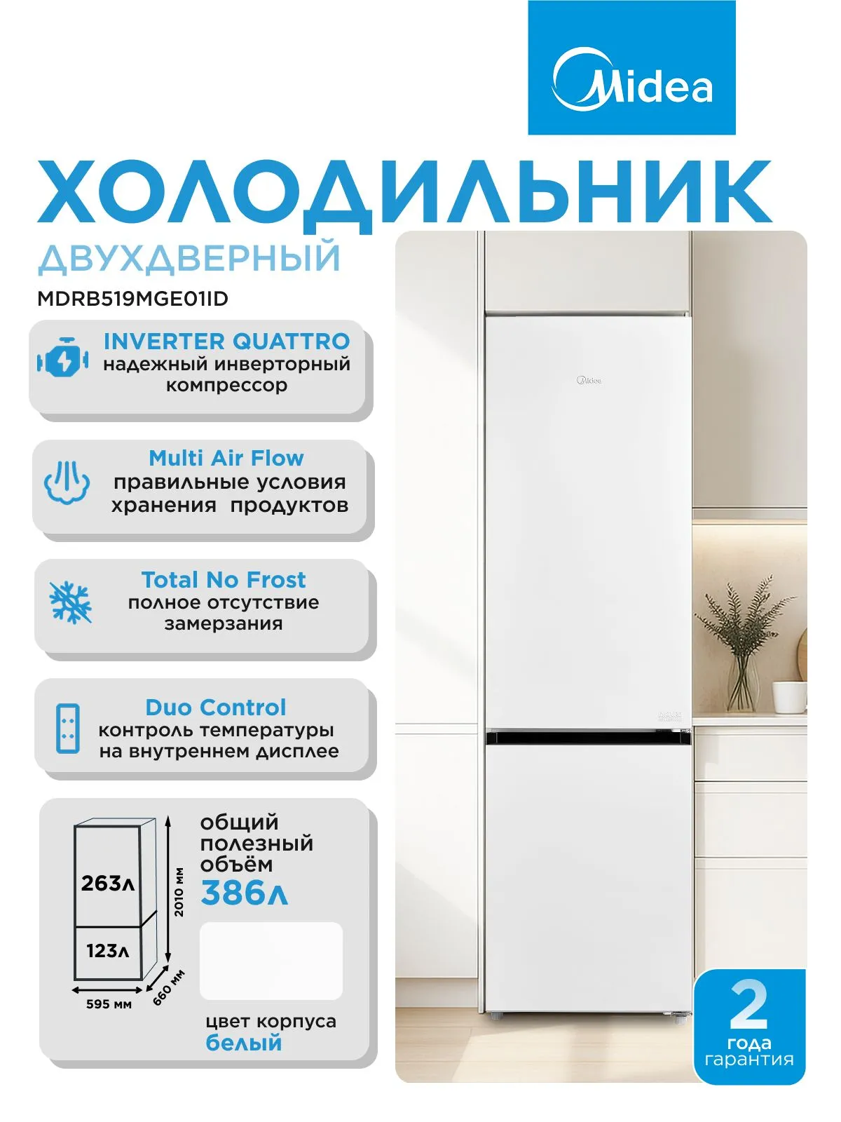 Двухкамерный холодильник Midea MDRB519MGE01ID общим объемом 402 литра дает достаточно места для хранения продуктов для всей семьи.