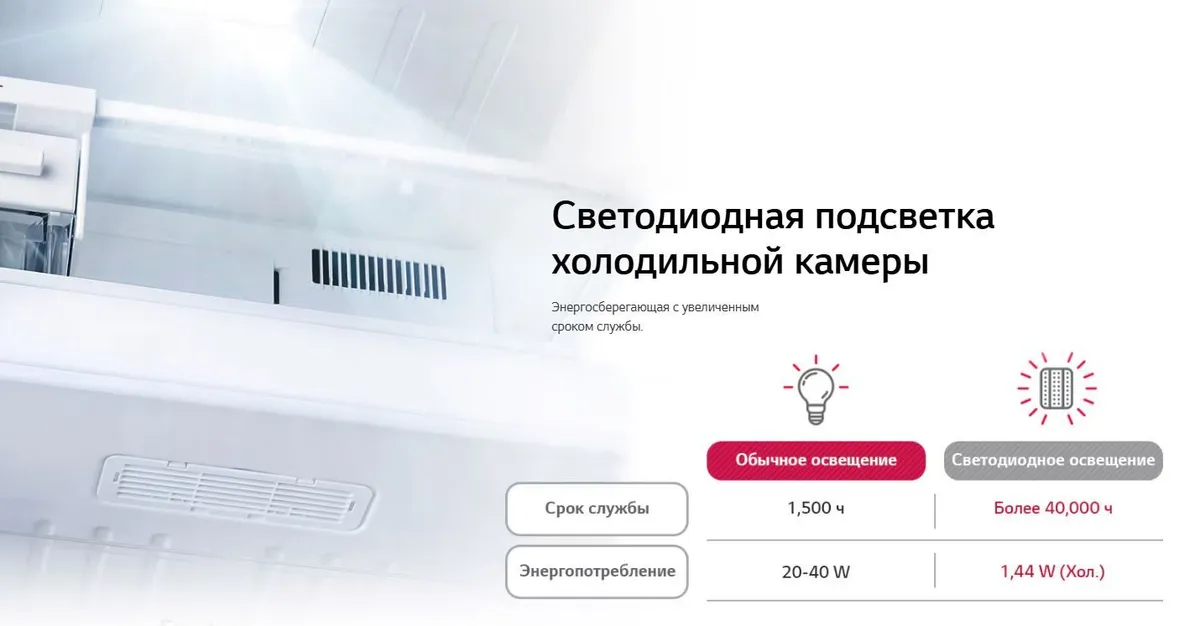 LED-освещение встроено в потолочную часть холодильной камеры. LED имеет яркий свет и больший срок службы по сравнению с обычными лампами накаливания