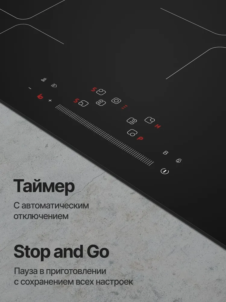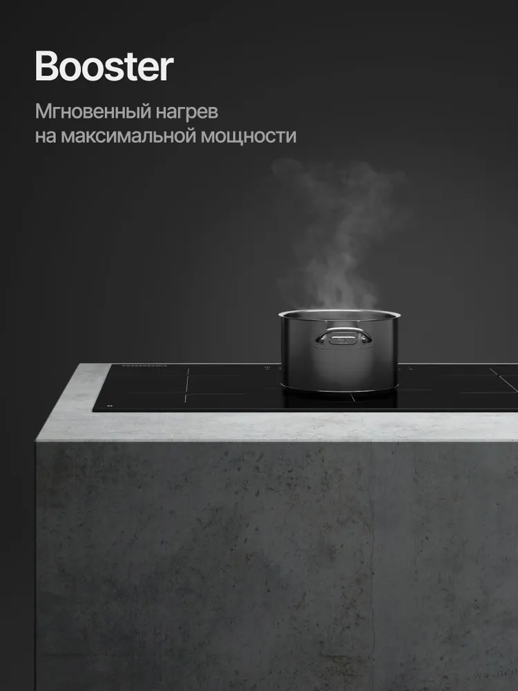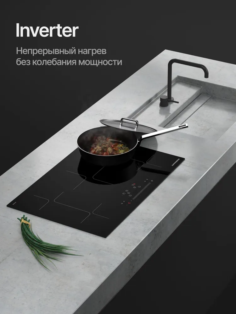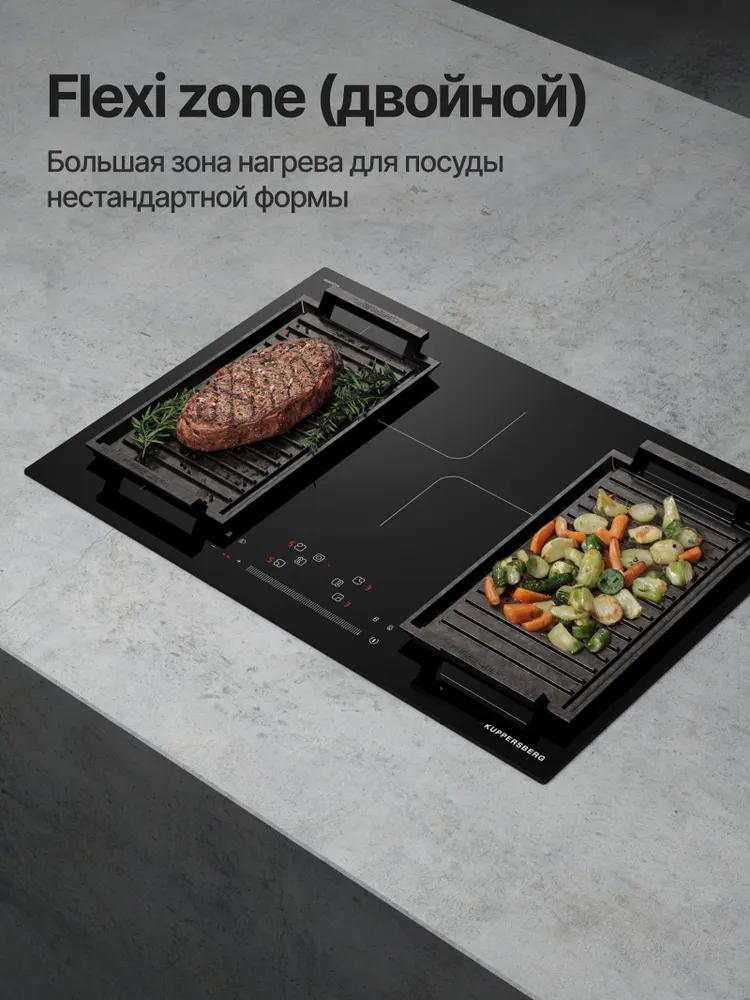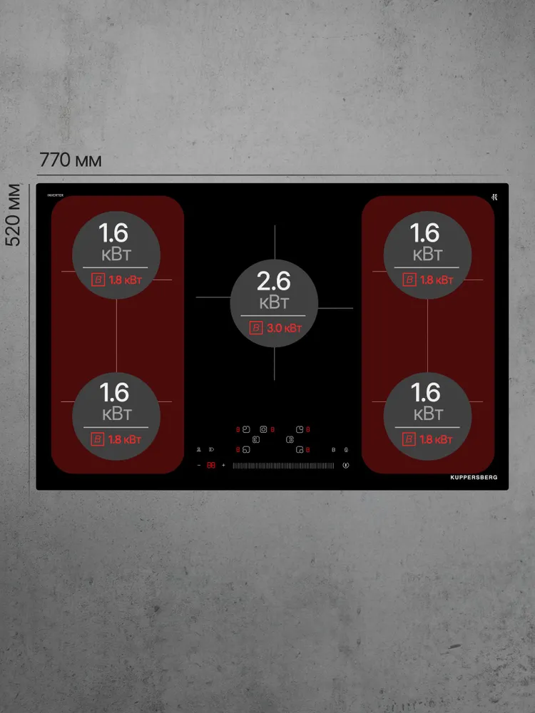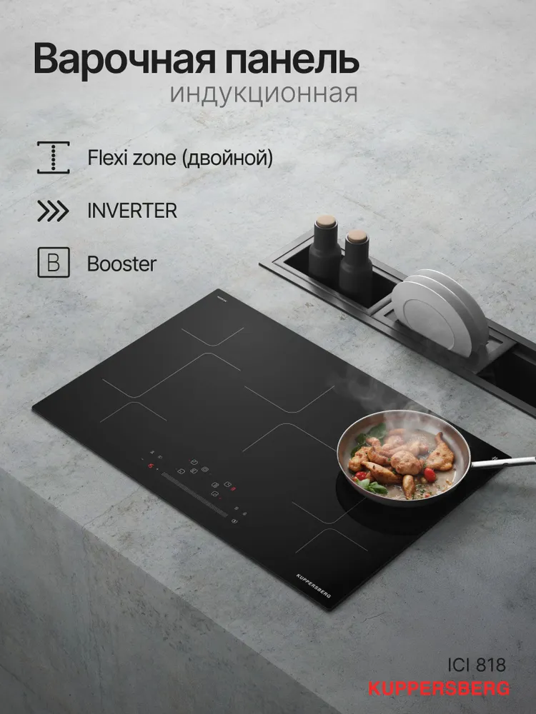 Индукционная варочная панель Kuppersberg ICI 818 оснащена пятью зонами нагрева, включая центральную зону диаметром 260 мм и мощностью до 3,0 кВт. Остальные конфорки — по 180 мм и 1,6 / 1,8 кВт. Технология Inverter обеспечивает точный контроль температуры, а функция Booster ускоряет нагрев. Сенсорное слайдер-управление, 9 уровней мощности, функция Stop&Go, таймер на каждую конфорку и блокировка панели обеспечивают удобство и безопасность. Индикаторы остаточного тепла и автоотключение делают модель надёжной в повседневном использовании. Kuppersberg ICI 818 — премиум-выбор для тех, кто ценит мощность и комфорт.