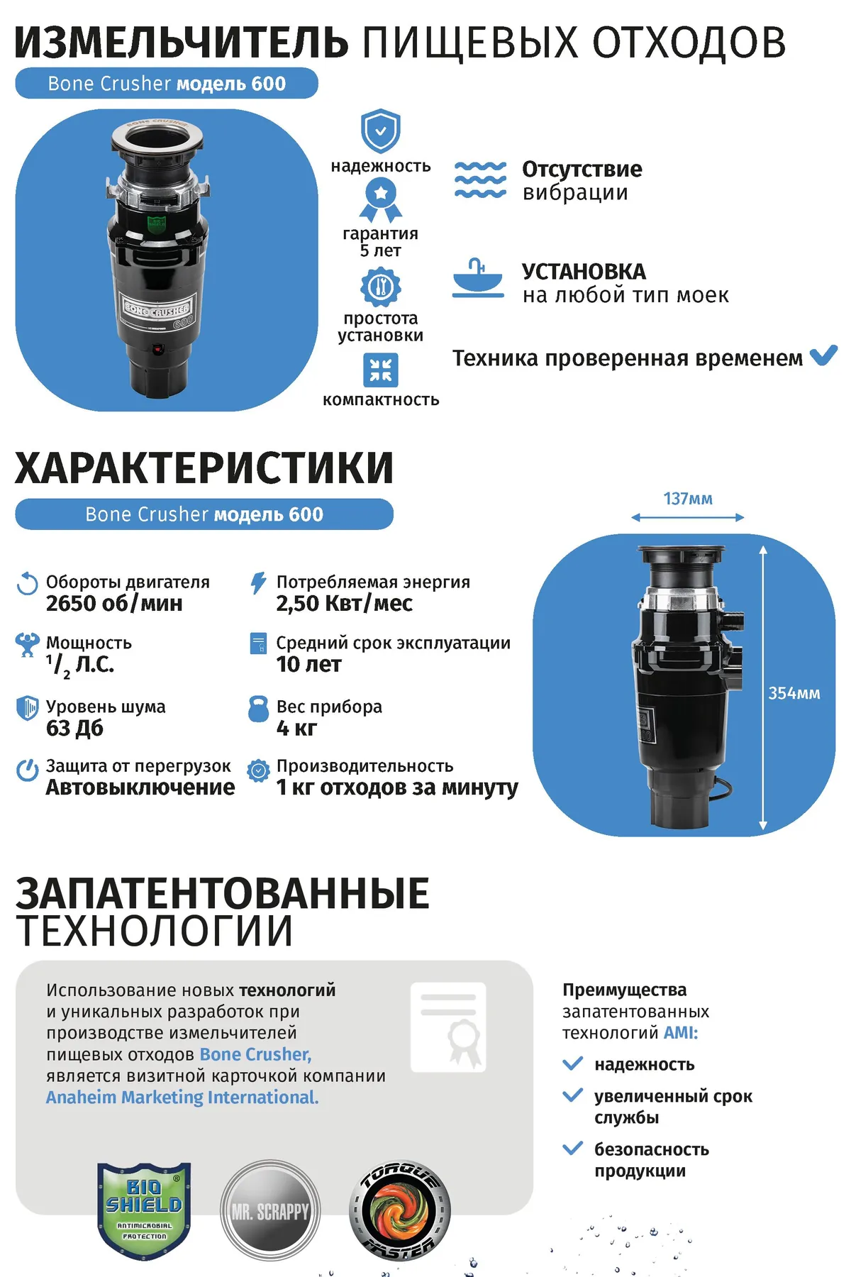 Измельчитель пищевых отходов BONE CRUSHER BC 600