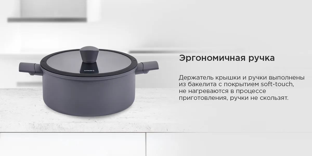 Ручки soft touch (приятные на ощупь) из специального термостойкого пластика бакелит. Длина ручек позволяет хозяйкам готовить, не опасаясь обжечься. Ручки не нагреваются.