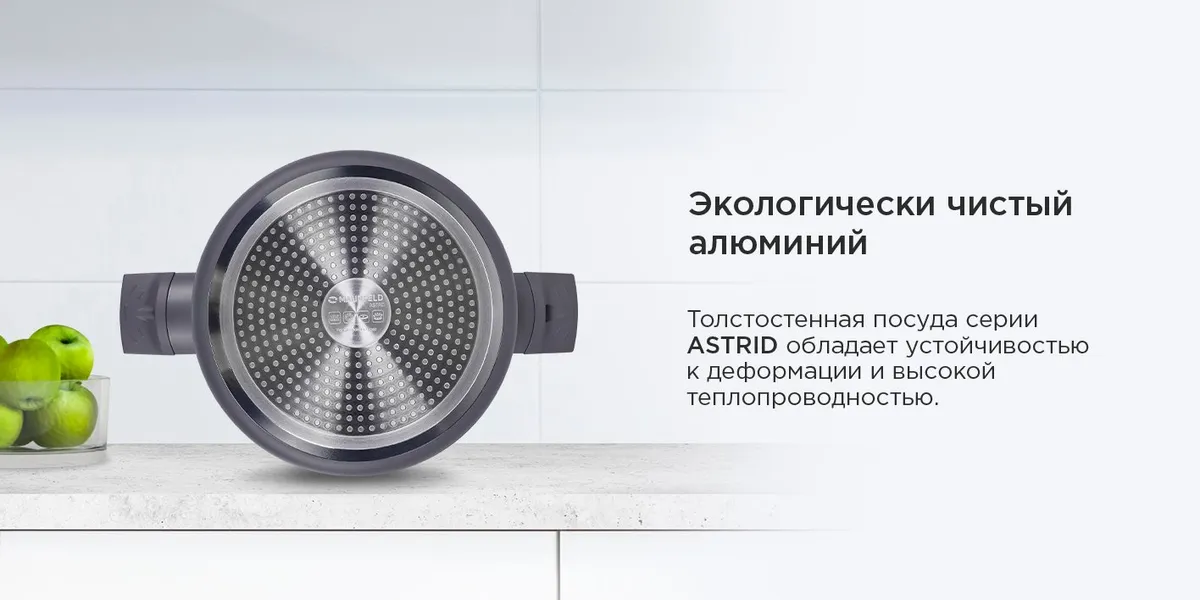 Толстые стенки обеспечивают высокую прочность и равномерное распределение тепла. Толщина дна составляет 3,5 мм., что оптимально для быстрого прогрева, идеальной теплопроводности и отсутствия риска деформации дна при нагреве.