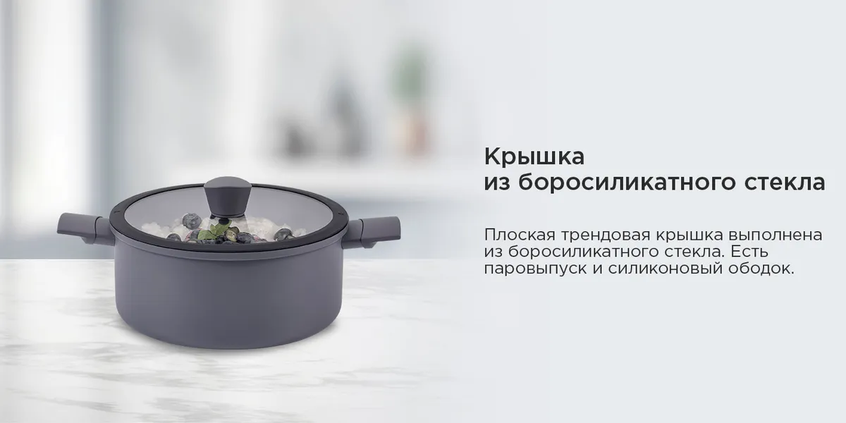 Кастрюля идет в комплектации со стеклянной жаропрочной крышкой. Бакелитовая ручка