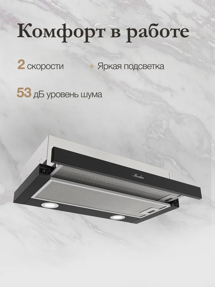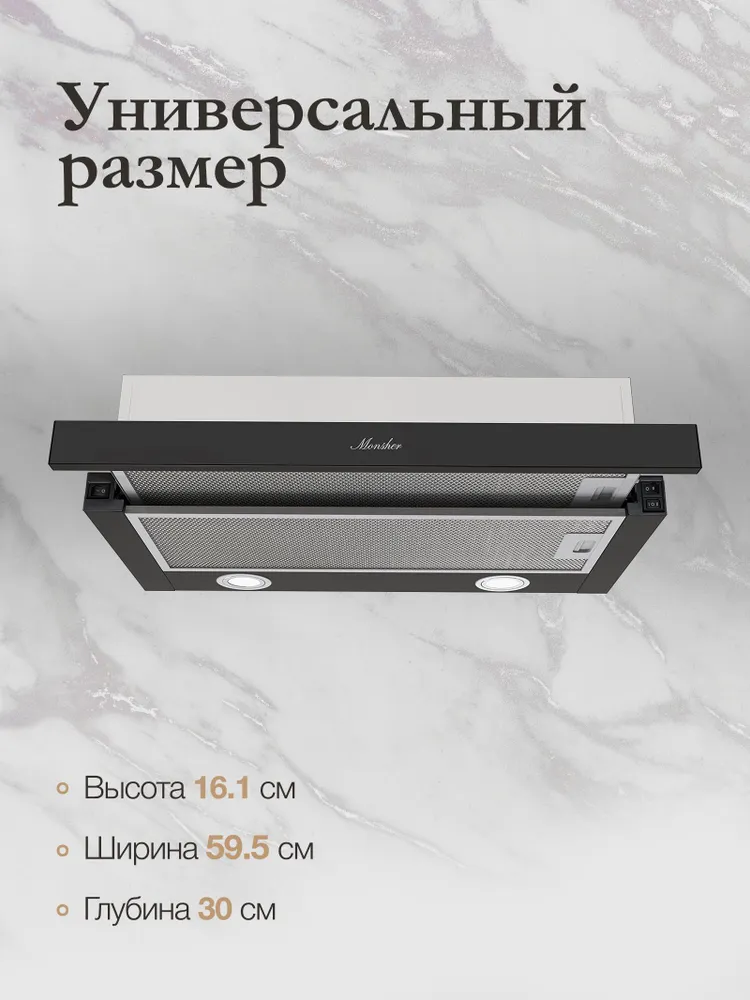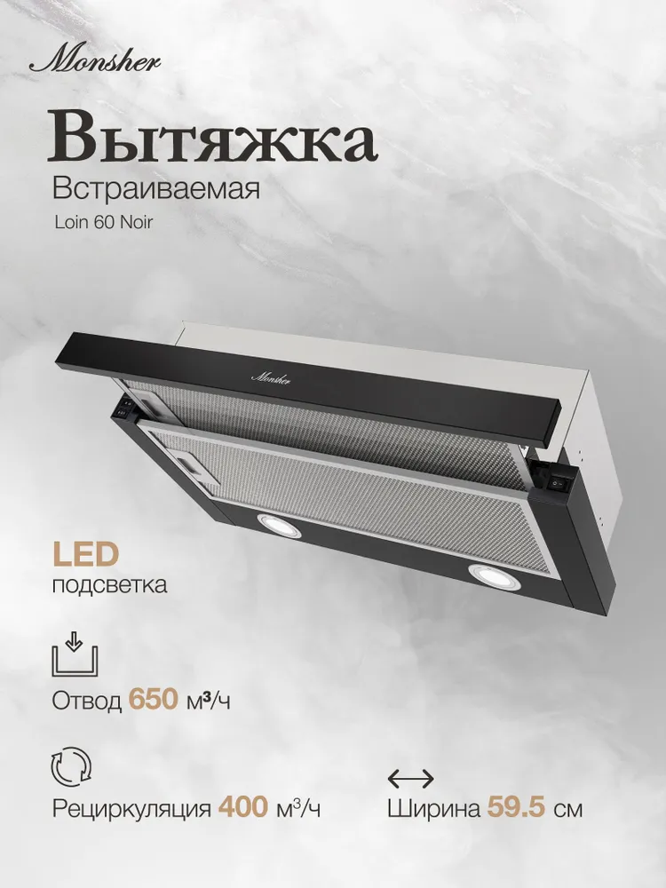 Вытяжка Monsher Loin 60 Noir — это эффективное и стильное решение для вашей кухни. Модель имеет размеры 59,5 x 16,1 x 30 см и вес 5,5 кг. Она оснащена двумя двигателями и двумя жировыми фильтрами, что обеспечивает высокую производительность отвода (650 куб. м/ч) и рециркуляции (400 куб. м/ч).