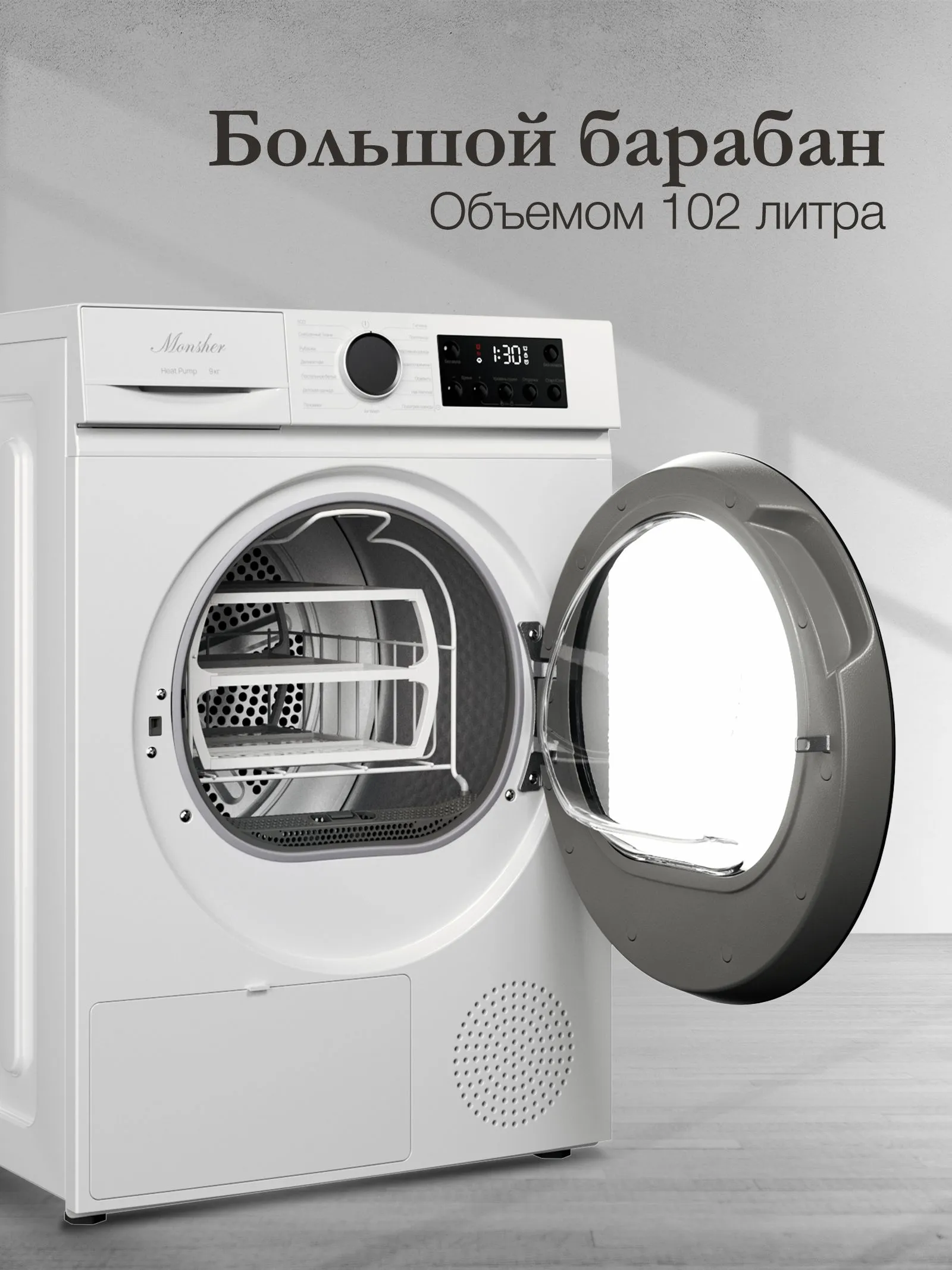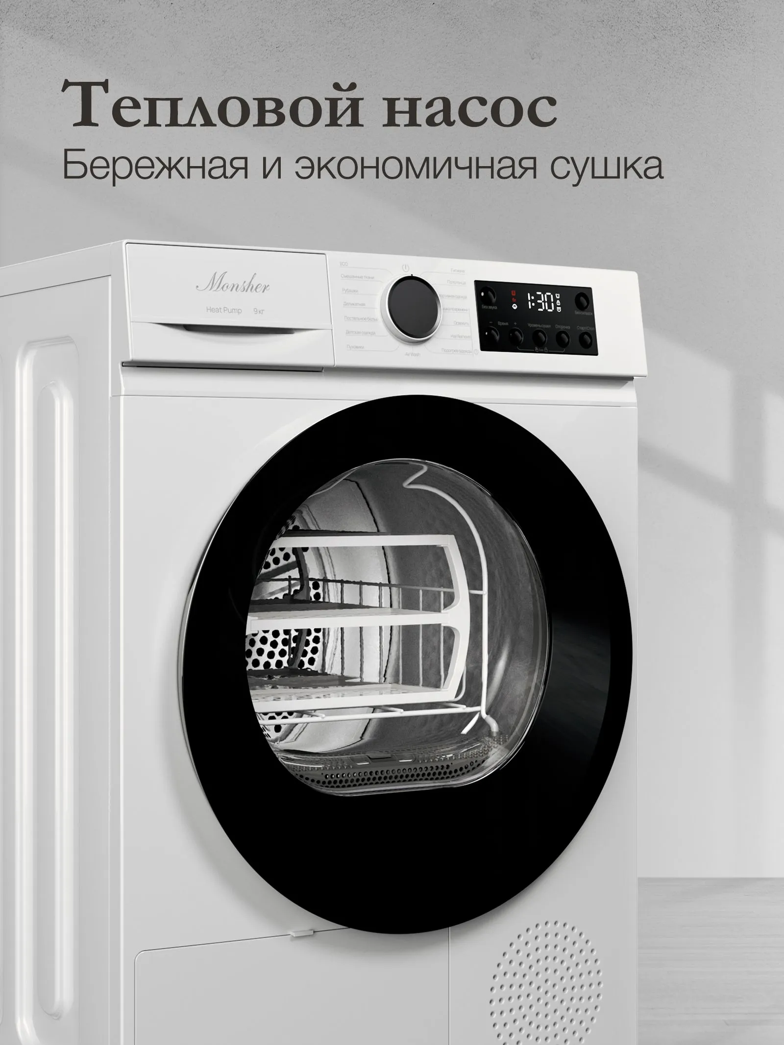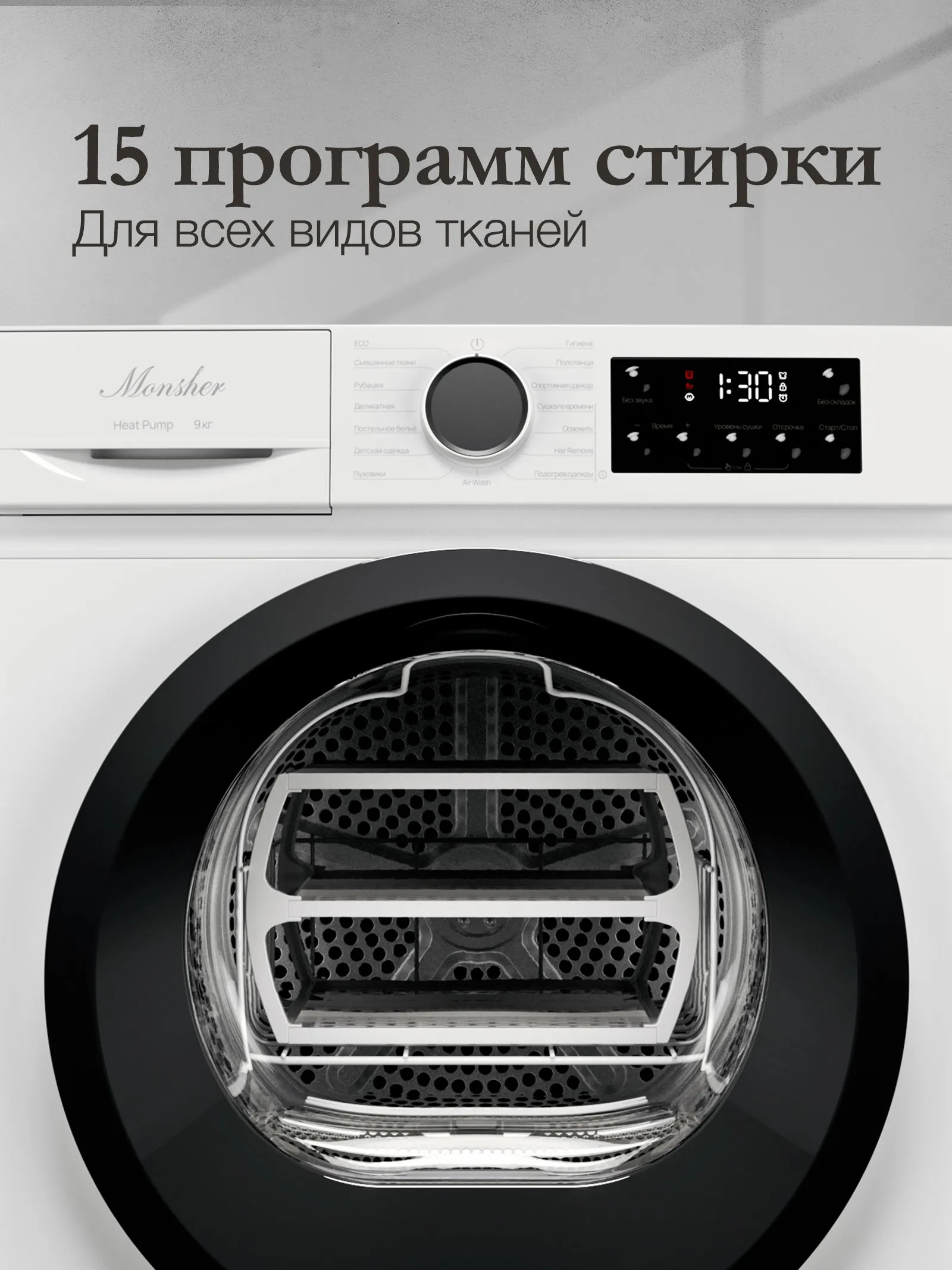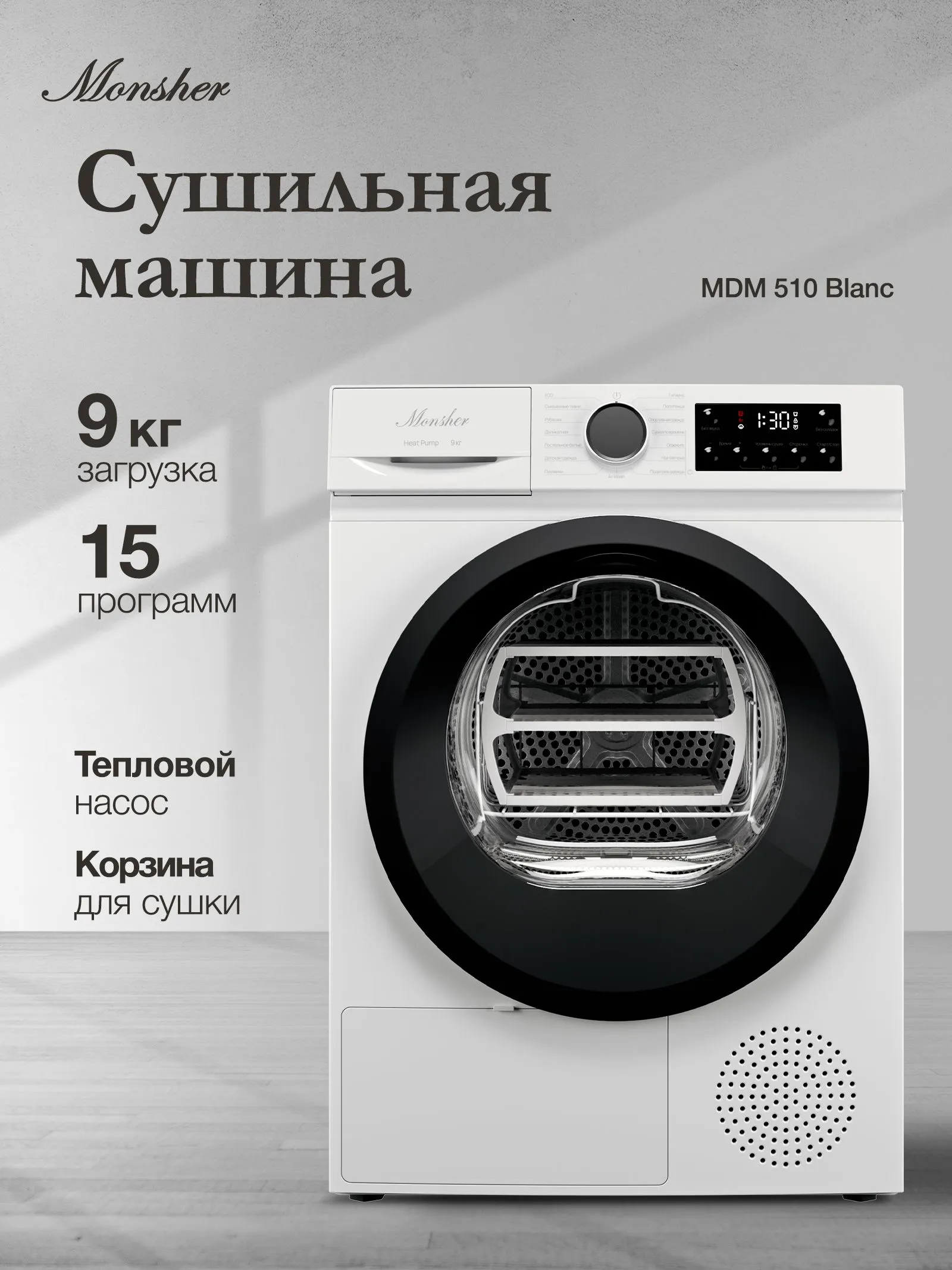 Сушильная машина Monsher MDM 510 Blanc с тепловым насосом (Heat Pump) — это бережный уход за тканями без риска усадки. Прибор вмещает до 9 кг белья и предлагает уникальные функции Air Wash для освежения одежды и Hair Removal для удаления шерсти. В комплекте идет специальная полка для сушки шерстяных изделий и обуви.