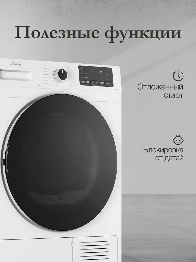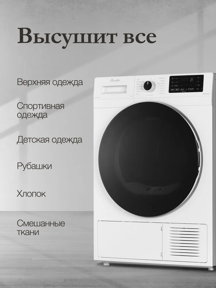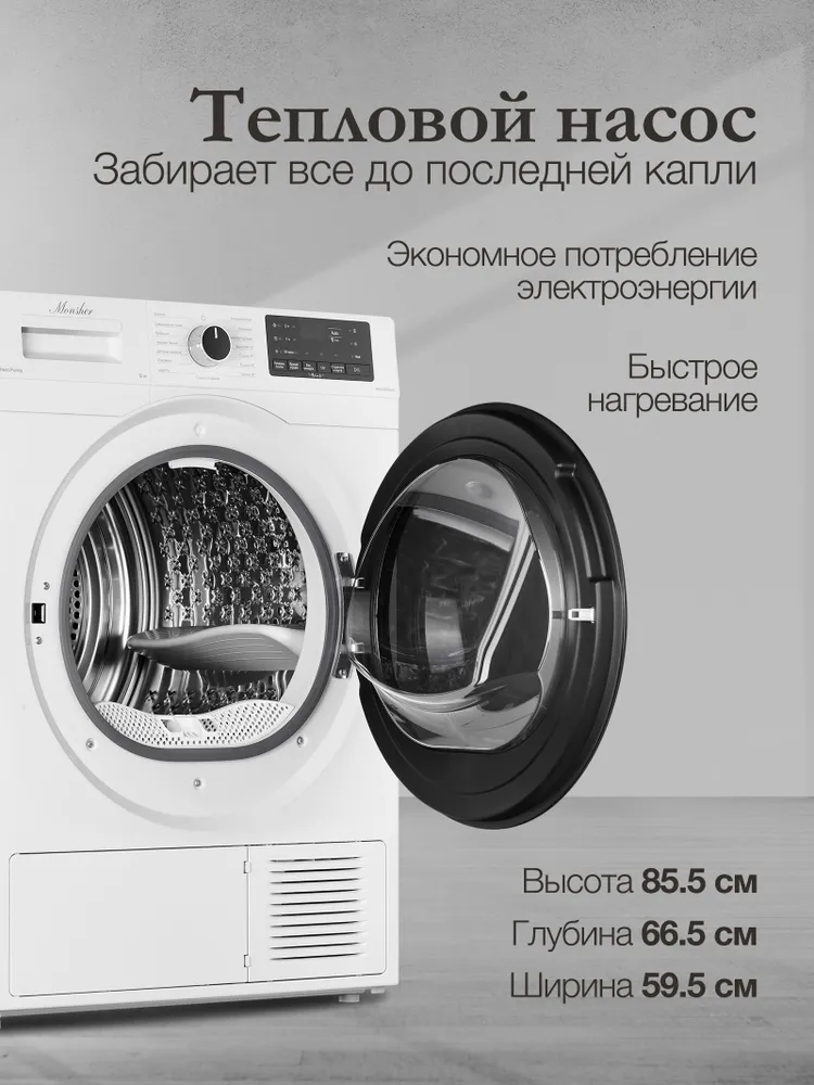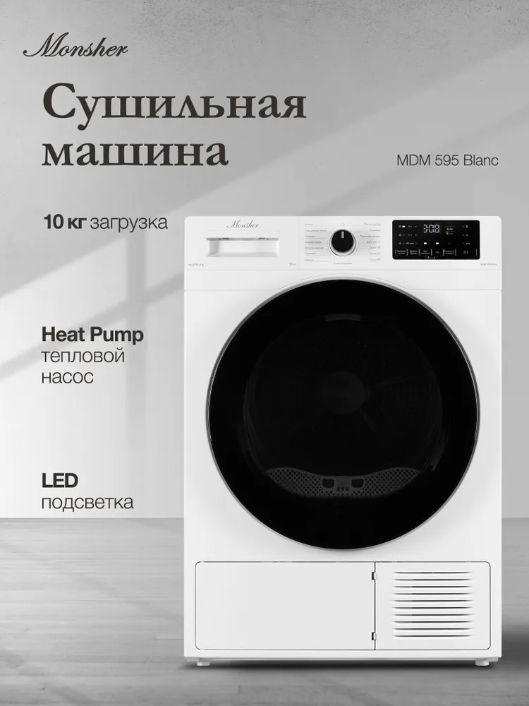 Сушильная машина Monsher MDM 595 Blanc — это надёжное и эффективное устройство для сушки белья. Она имеет фронтальный тип загрузки и вмещает до 10 кг белья, что делает её подходящей для больших семей.