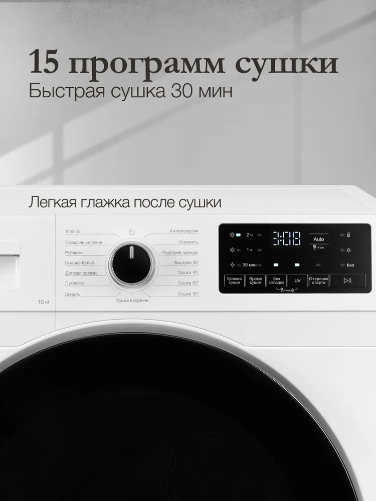 Модель оснащена сенсорным управлением и предлагает 15 программ сушки, включая опцию отложенного старта до 24 часов. Тип сушки — с тепловым насосом, что обеспечивает энергоэффективность класса A+.