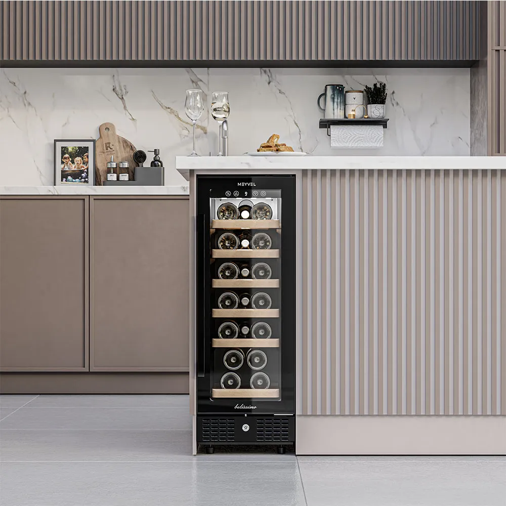 Meyvel MV19BIG-KBT1 вмещает до 19 бутылок типа «Бордо» — это может быть небольшая винотека, тщательно подобранная для особых поводов. Такая система хранения подходит тем, кто выбирает не «много», а «точно».