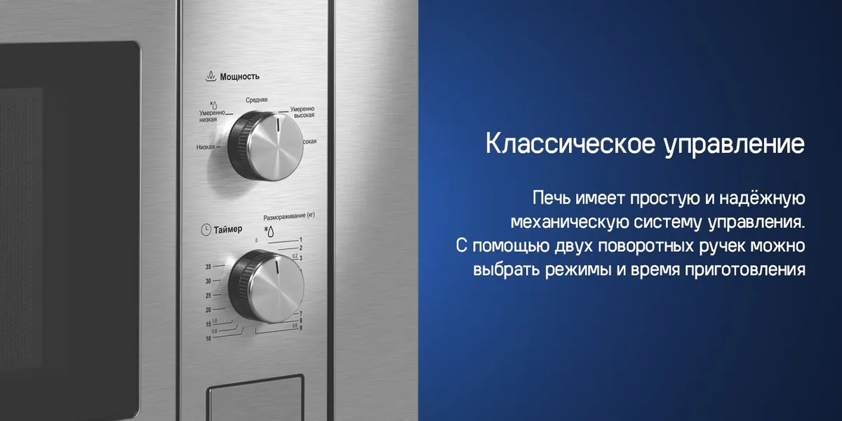 Особенностью модели является механическое управление с помощью поворотных элементов. Это делает процесс использования прибора удобным и понятным даже для тех, кто не имеет опыта работы с подобной техникой. Также в модели предусмотрен таймер с звуковым сигналом, который уведомит вас о готовности блюда.