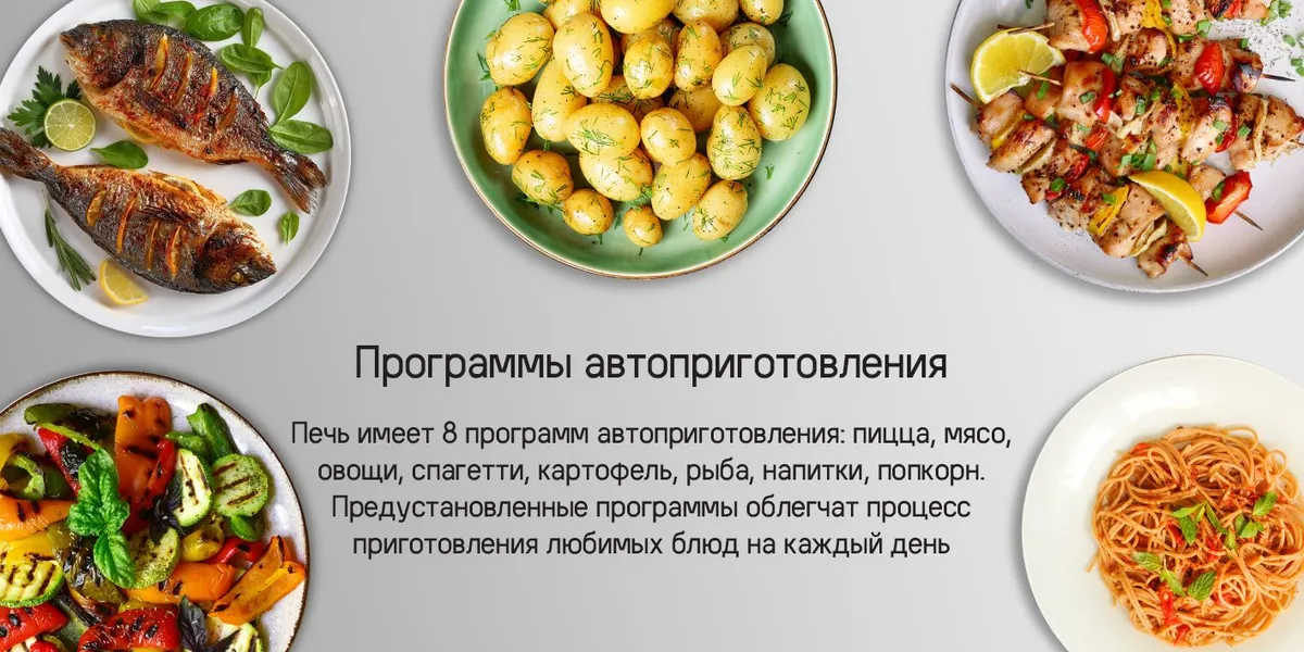 Режимы работы: 8 режим микроволн, режим быстрого приготовления, режим гриля, режим комби, размораживание по весу, размораживание по времени, многоступенчатый режим, автоприготовление