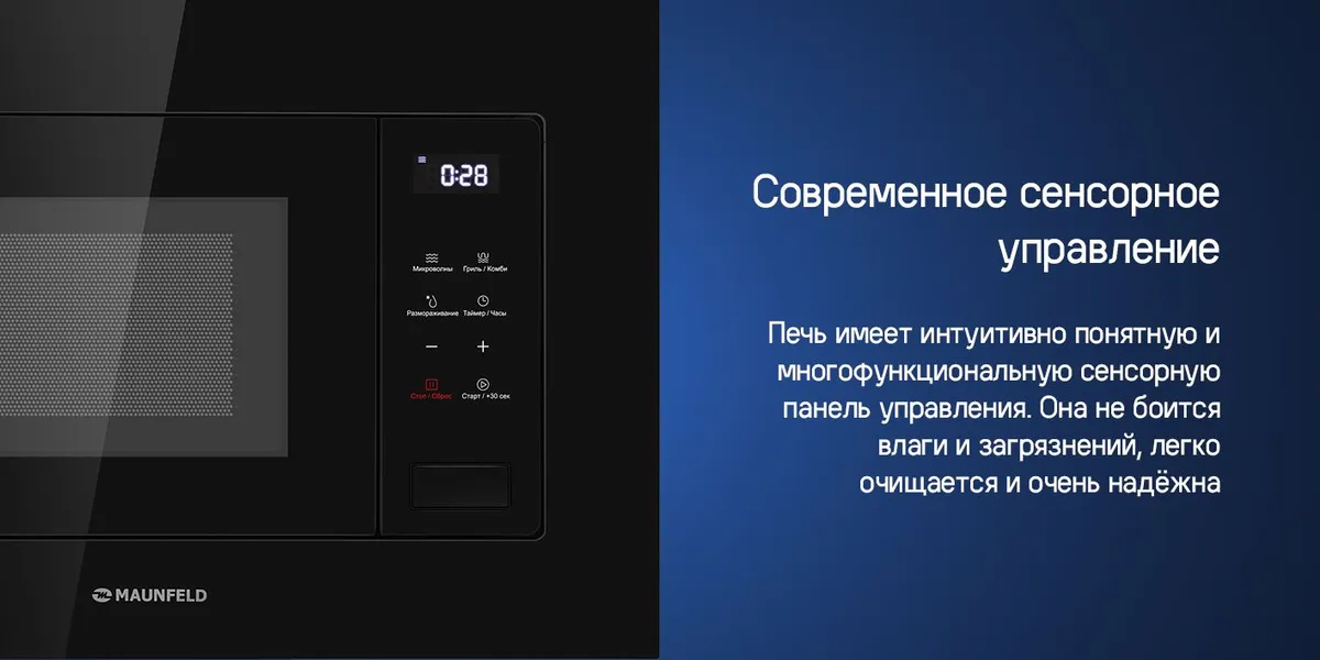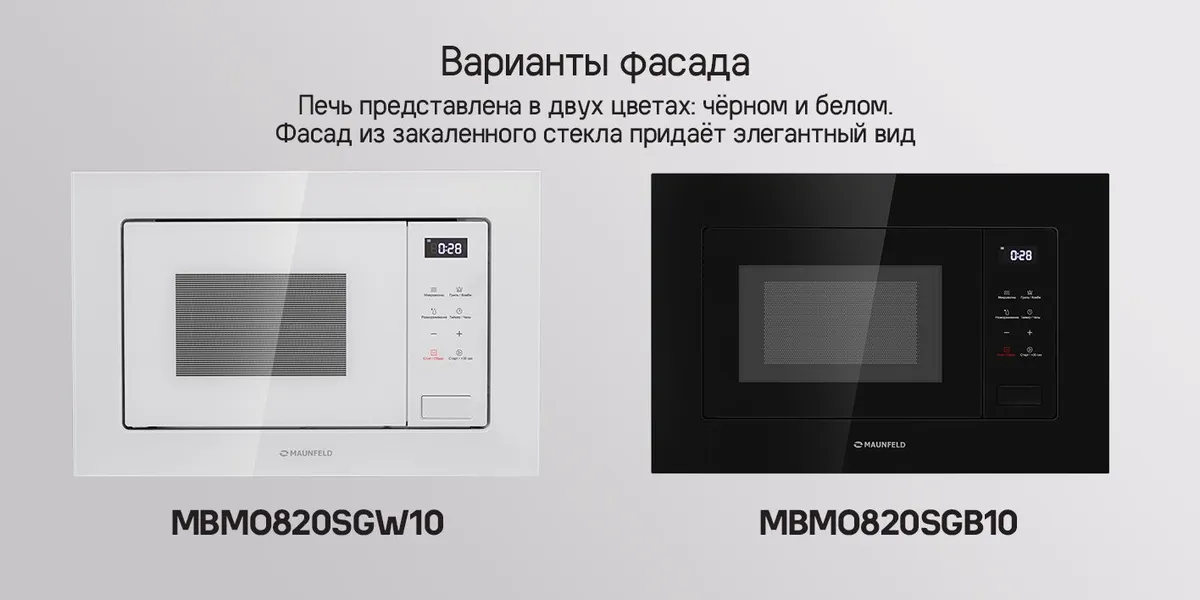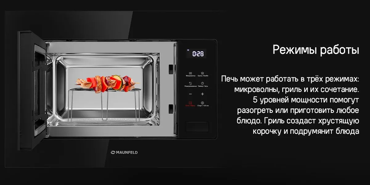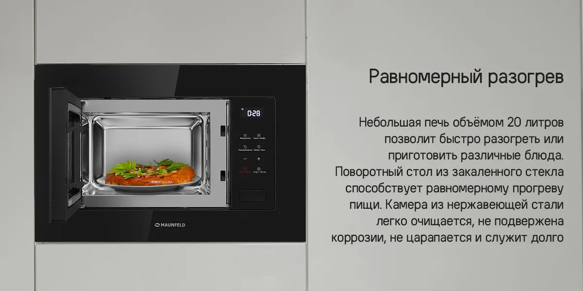 Микроволновая печь MAUNFELD MBMO820SGB10 комбинированного типа. Можно использовать только микроволны, только гриль или и то, и другое вместе. В СВЧ можно размораживать продукты по весу и времени. Мыть прибор вручную необязательно, для этого есть система очистки паром с помощью микроволн.