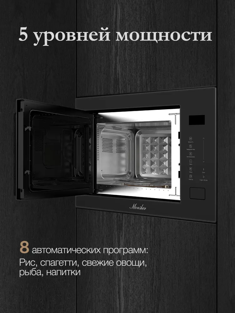 Встраиваемая микроволновая печь Monsher MMH 1025 Noir — стильное и функциональное решение для кухни, сочетающее современный дизайн и практичность. Модель предназначена для установки в колонну, что помогает сохранить чистые линии и аккуратный интерьер. Объём камеры составляет 25 л, что обеспечивает достаточно пространства для разогрева или приготовления блюд для всей семьи. Управление полностью электронное и сенсорное, а панель из стекла делает интерфейс понятным и удобным. Печь оснащена 8 автоматическими программами для разных задач и функцией размораживания по весу и времени, что упрощает подготовку продуктов. Внутренняя поверхность камеры выполнена из нержавеющей стали, а мощность микроволн — 850 Вт — обеспечивает быстрый и равномерный прогрев. Кварцевый гриль мощностью 1200 Вт позволяет получить золотистую корочку на блюдах, а поворотный стол диаметром 31,5 см помогает равномерно распределить тепло. Электронный таймер, встроенные часы и блокировка от детей делают эксплуатацию безопасной и удобной.