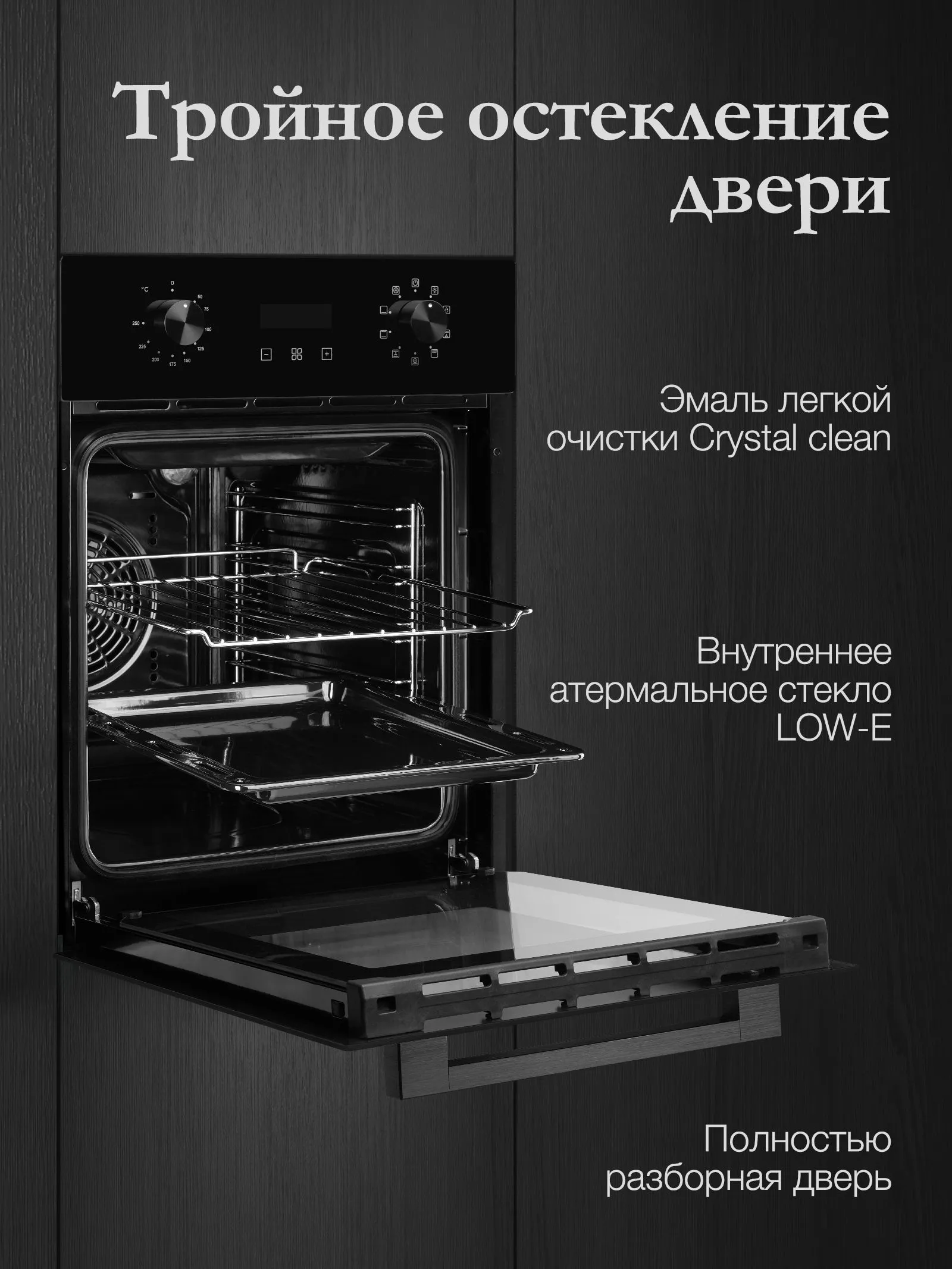 Откидная дверца с тремя стёклами обеспечивает безопасность использования и лёгкость очистки. Подсветка камеры и дисплей делают управление духовым шкафом удобным и интуитивно понятным. Размораживание и таймер позволяют точно контролировать процесс приготовления пищи.