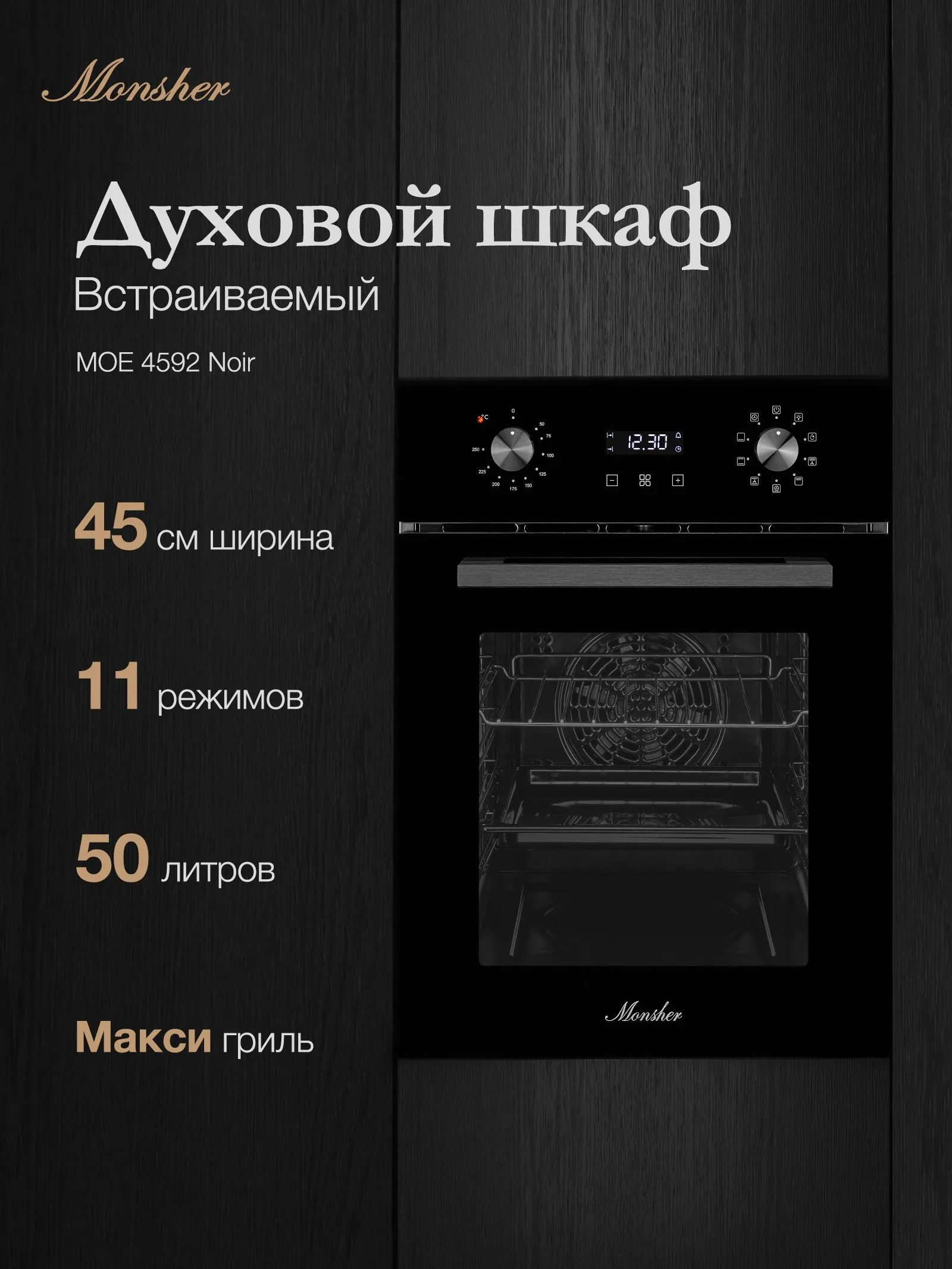 Электрический духовой шкаф Monsher MOE 4592 Noir — это современное и функциональное решение для вашей кухни. Он выполнен в чёрном цвете с вставками из нержавеющей стали, что придаёт ему стильный и современный вид.