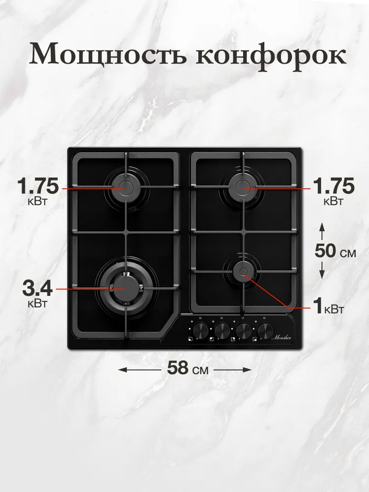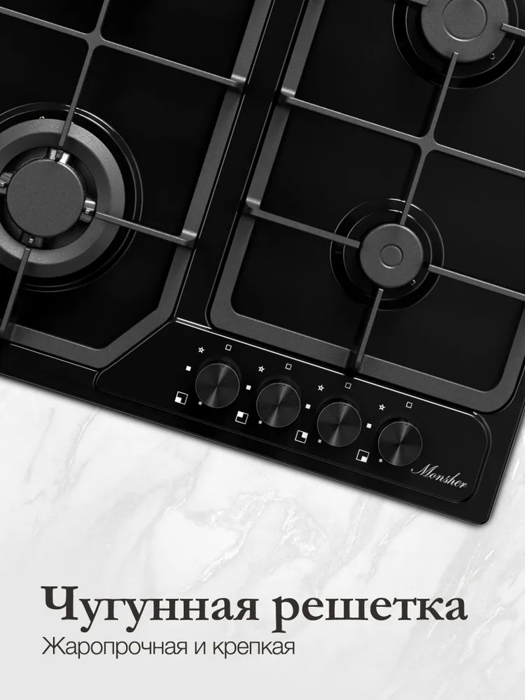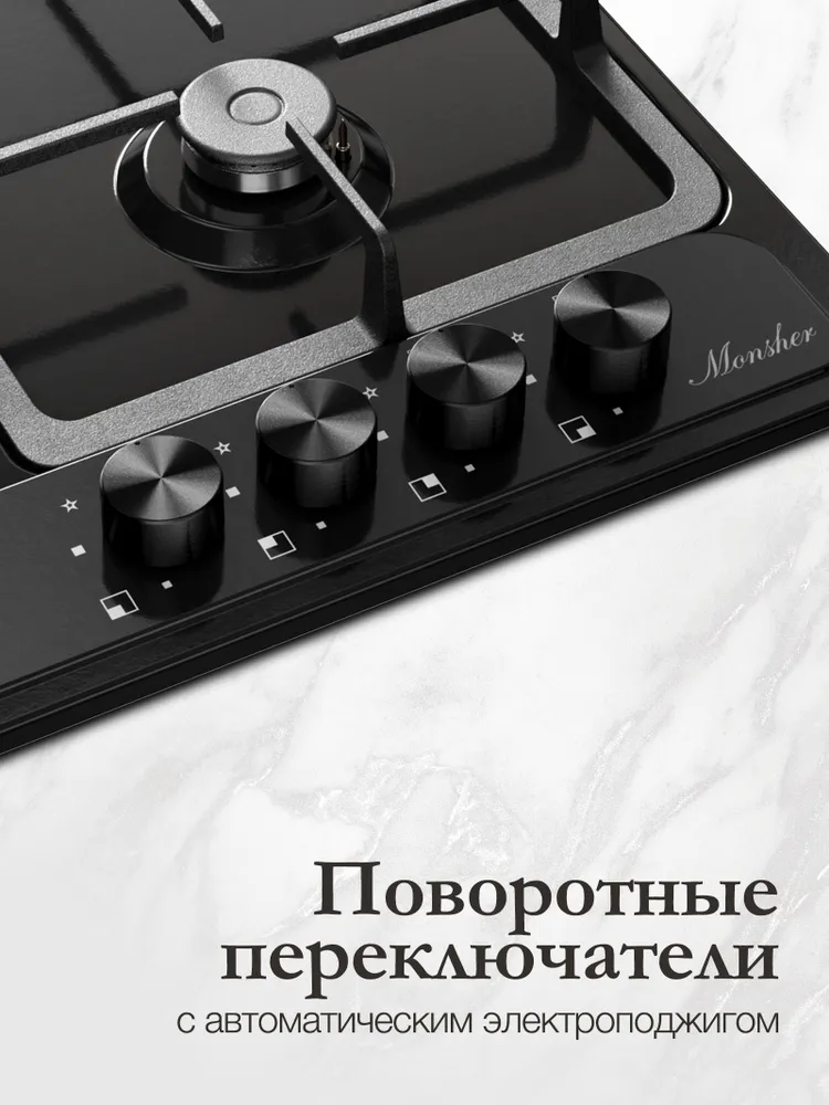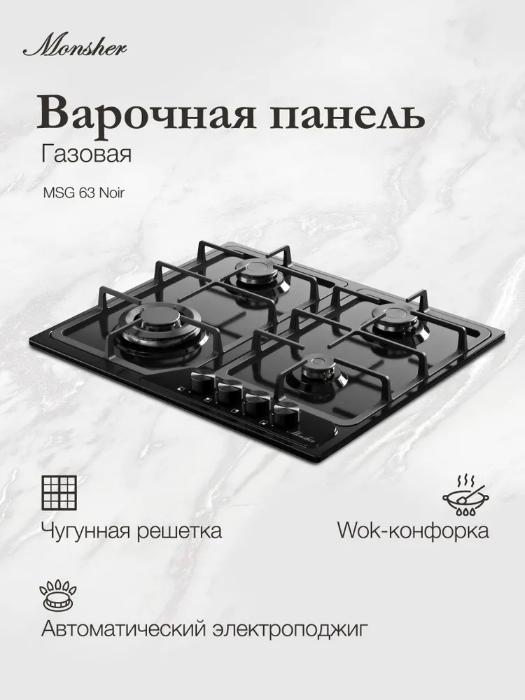 Варочная поверхность Monsher MSG 63 Noir — это газовая варочная панель с четырьмя конфорками, изготовленная из эмалированной стали. Решётки варочной панели выполнены из чугуна. Варочная поверхность имеет размеры 580 x 52 x 500 мм и вес 9 кг. Мощность конфорок составляет от 1 кВт до 3,4 кВт. Варочная панель оснащена автоматическим электроподжигом. Гарантийный срок составляет 2 года.