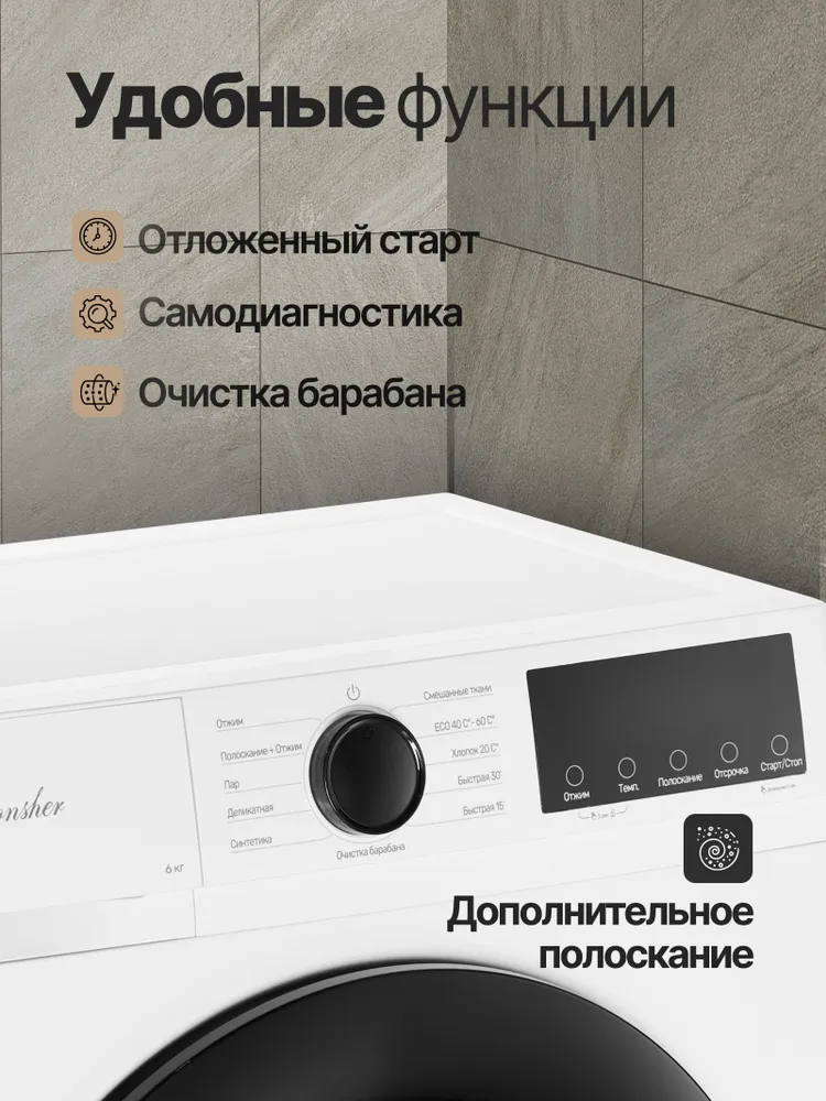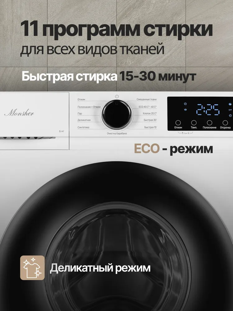 Дополнительные особенности включают датчик определения загрузки, самодиагностику и дополнительное полоскание. Стиральная машина Monsher MWM 410 Blanc имеет сенсорное управление и диаметр люка 500 мм, что облегчает загрузку и выгрузку белья.