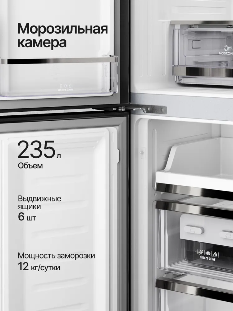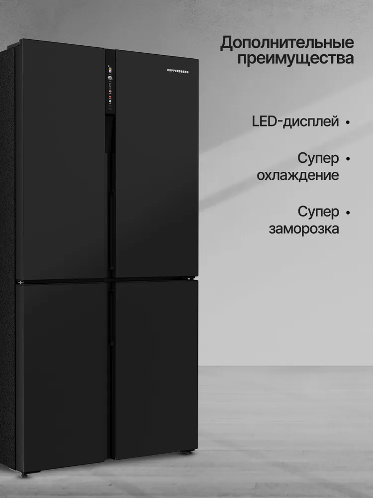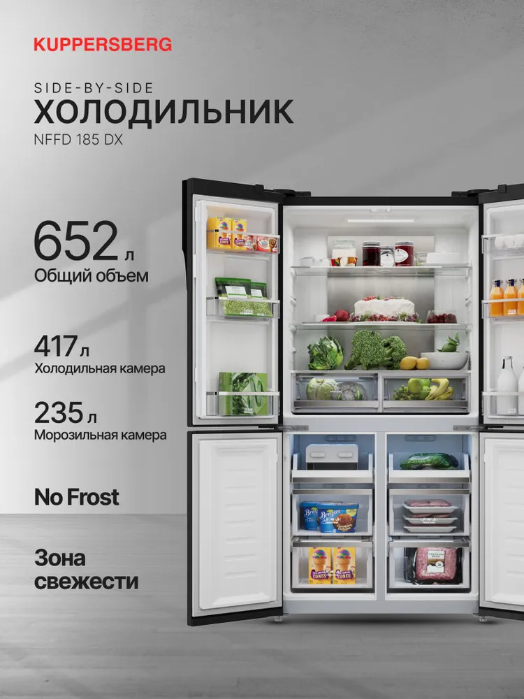 Холодильник отдельностоящий Kuppersberg NFFD 185 DXХолодильник отдельностоящий Kuppersberg NFFD 185 DX — это вместительная и функциональная модель с сенсорным управлением и LED-дисплеем. Общий объём холодильника составляет 539 литров, из которых 322 литра приходится на холодильную камеру, а 217 литров — на морозильную. Морозильная камера расположена снизу. Холодильник оснащён системой размораживания, имеет режим «Отпуск» и может автономно сохранять холод в течение 10 часов. Модель отличается высоким классом энергопотребления A++, а её максимальный уровень шума составляет 37 дБ. Холодильник Kuppersberg NFFD 185 DX имеет 4 камеры, 4 двери, 3 стеклянные полки и 6 навесных дверных полок. Мощность замораживания достигает 12 кг/сутки.