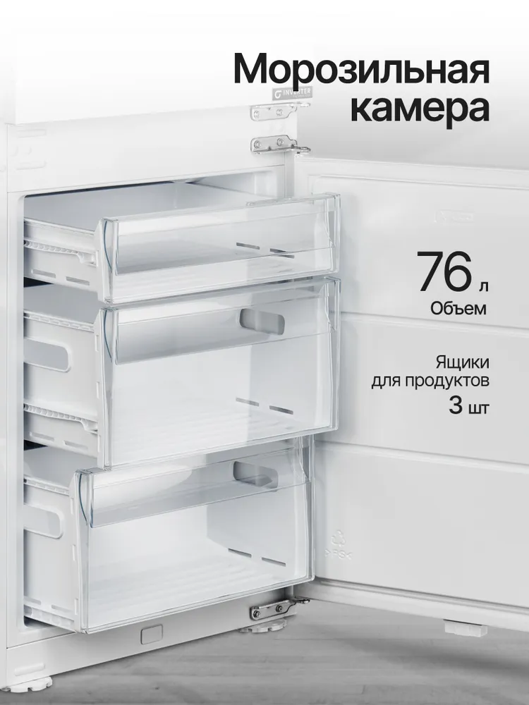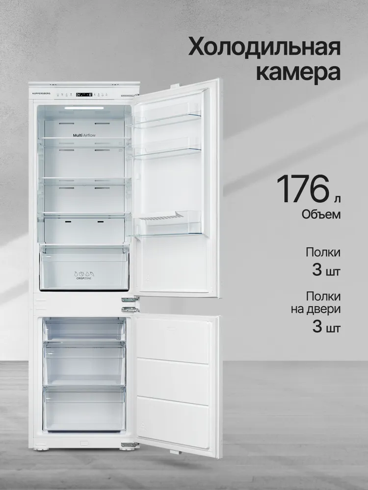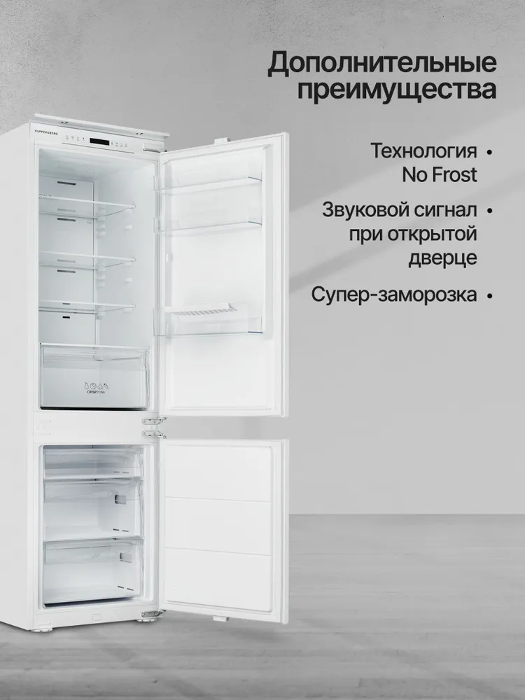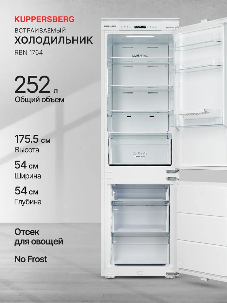 Холодильник встраиваемый Kuppersberg RBN 1764 — это модель с инверторным компрессором и двумя камерами, предназначенная для встраивания в кухонный гарнитур. Общий объём холодильника составляет 252 литра, из них 176 литров приходится на холодильное отделение, а 76 литров — на морозильное. Морозильная камера расположена снизу.