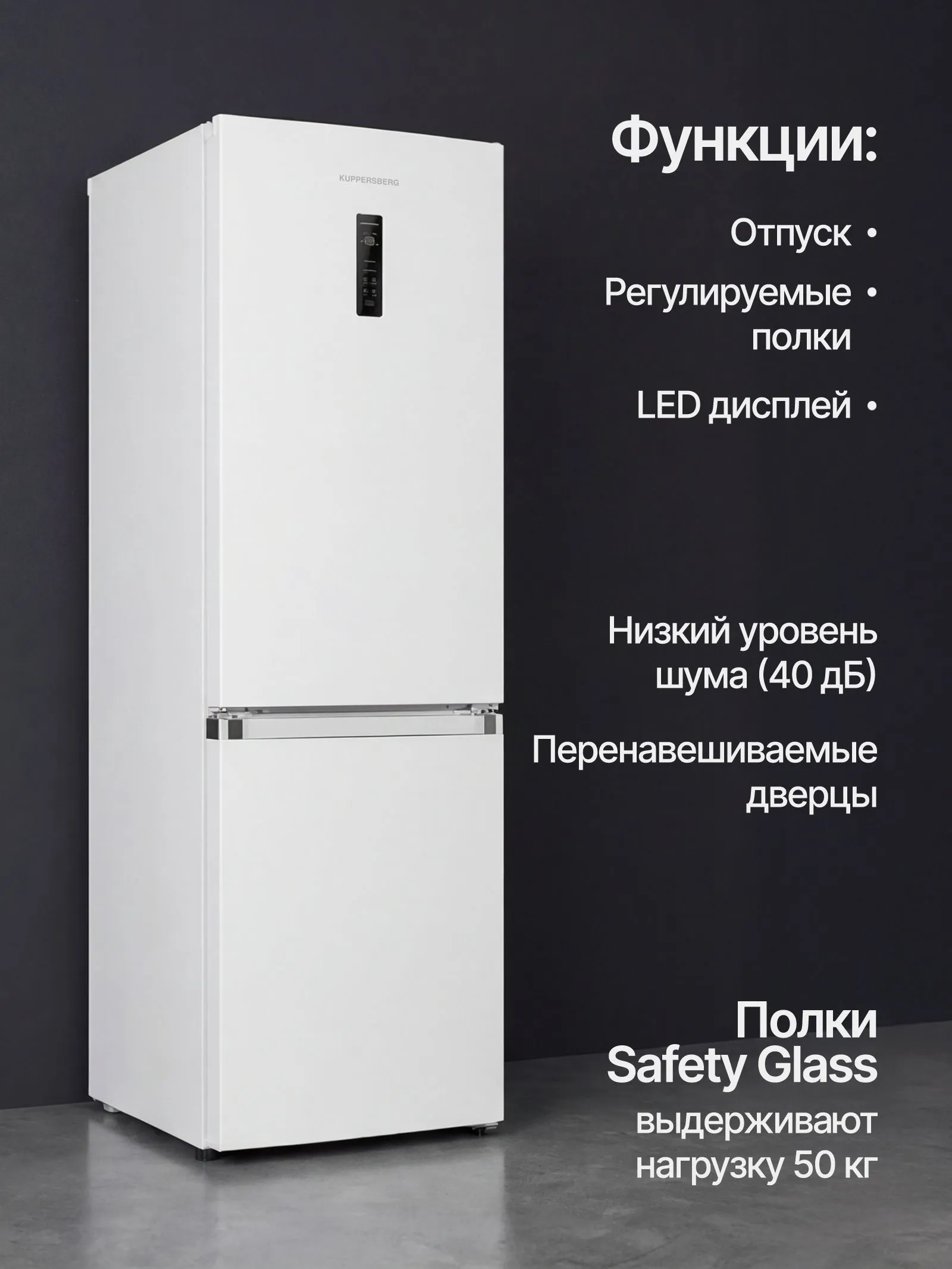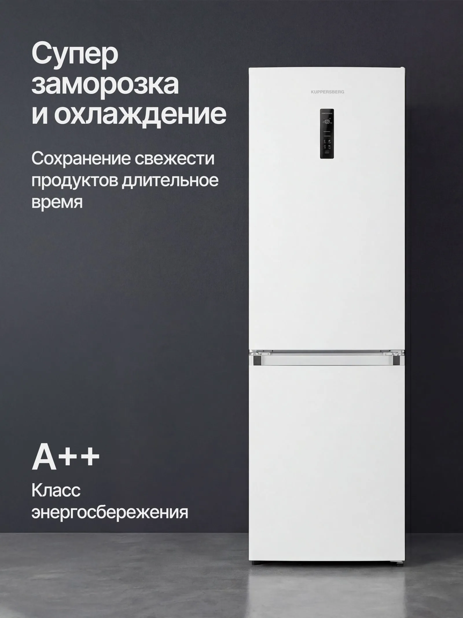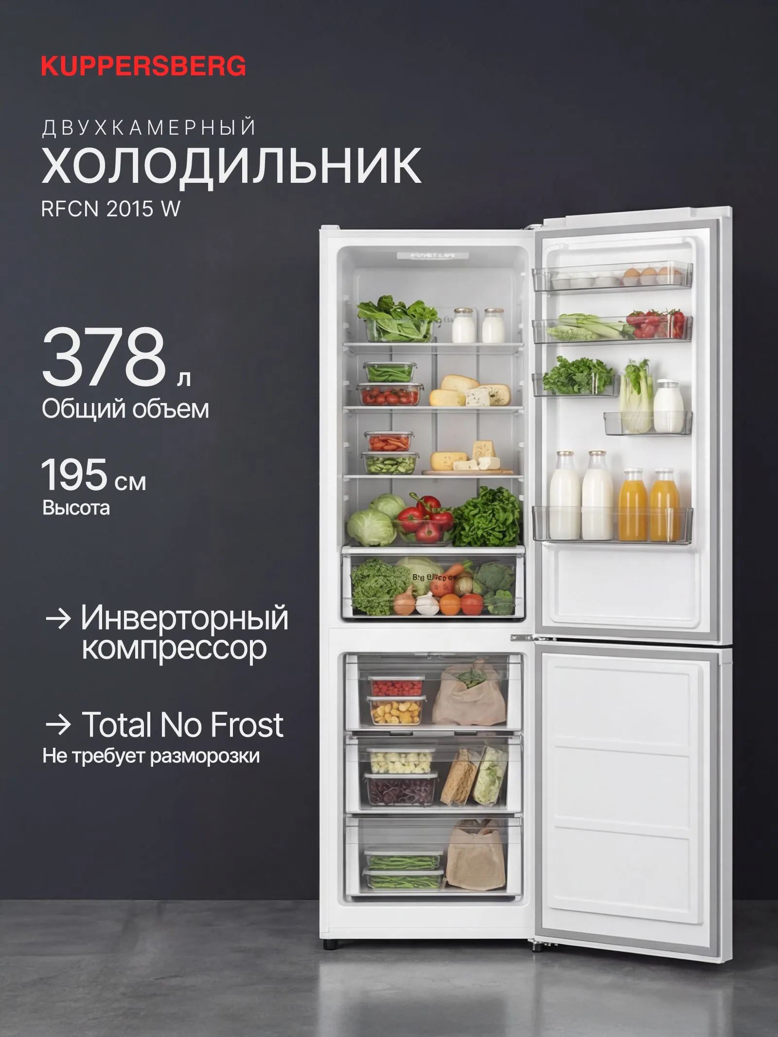 Kuppersberg RFCN 2015 W — это современный двухкамерный холодильник из коллекции High-Tech, выполненный в классическом белом цвете. Модель оснащена передовым инверторным компрессором, который обеспечивает тихую работу (40 дБ) и высокий класс энергоэффективности A++. Total No Frost: забудьте о разморозке Система Total No Frost полностью исключает образование инея и наледи на стенках обеих камер. Это позволяет поддерживать идеальный порядок и избавляет от необходимости ручного размораживания, сохраняя свежесть продуктов надолго. Объем 378 литров: пространство для хранения При высоте 195 см холодильник обладает внушительным общим объемом 378 литров. Холодильное отделение на 235 литров укомплектовано четырьмя стеклянными полками, три из которых регулируются по высоте, и пятью дверными балконами для удобной организации пространства. Морозильная камера: мощь и объем Нижний морозильный отсек полезным объемом 109 литров оснащен тремя вместительными выдвижными ящиками. Мощность замораживания составляет 8 кг в сутки, а функции «Супер заморозка» и «Супер охлаждение» позволяют быстро подготовить продукты к длительному хранению. Управление и режимы: интеллектуальный контроль Электронное управление с внешним LED-дисплеем позволяет точно настраивать параметры работы устройства. Специальный режим «Отпуск» оптимизирует энергопотребление во время вашего отсутствия, а звуковая индикация и хранение холода до 8 часов при отключении питания гарантируют сохранность продуктов. Продуманный дизайн: эргономика и свет Внутреннее пространство освещается современными светодиодами, которые обеспечивают отличную видимость на всех полках. Для гибкости планировки кухни предусмотрена возможность перенавешивания дверей, что позволяет адаптировать открывание холодильника под любое пространство.