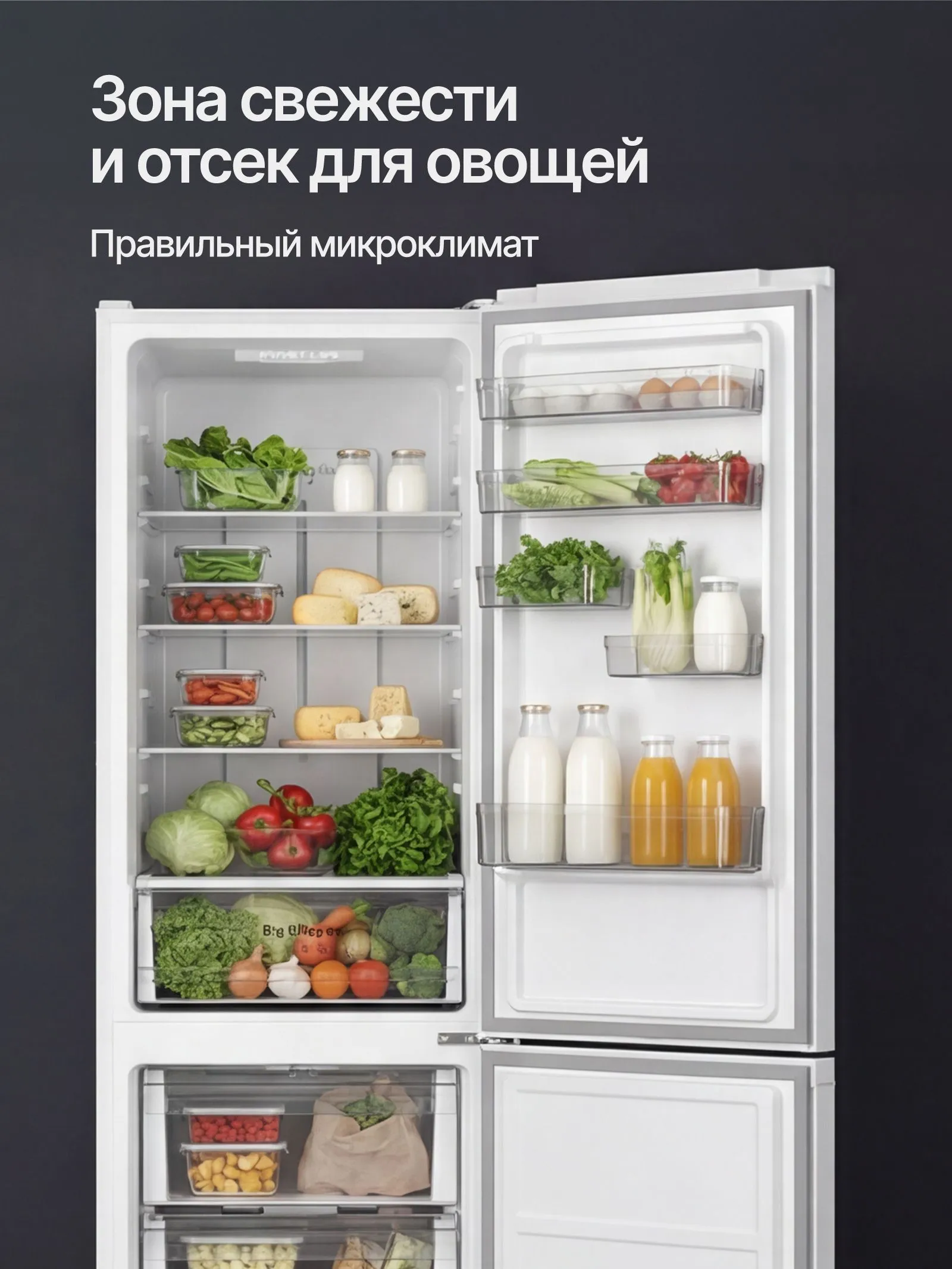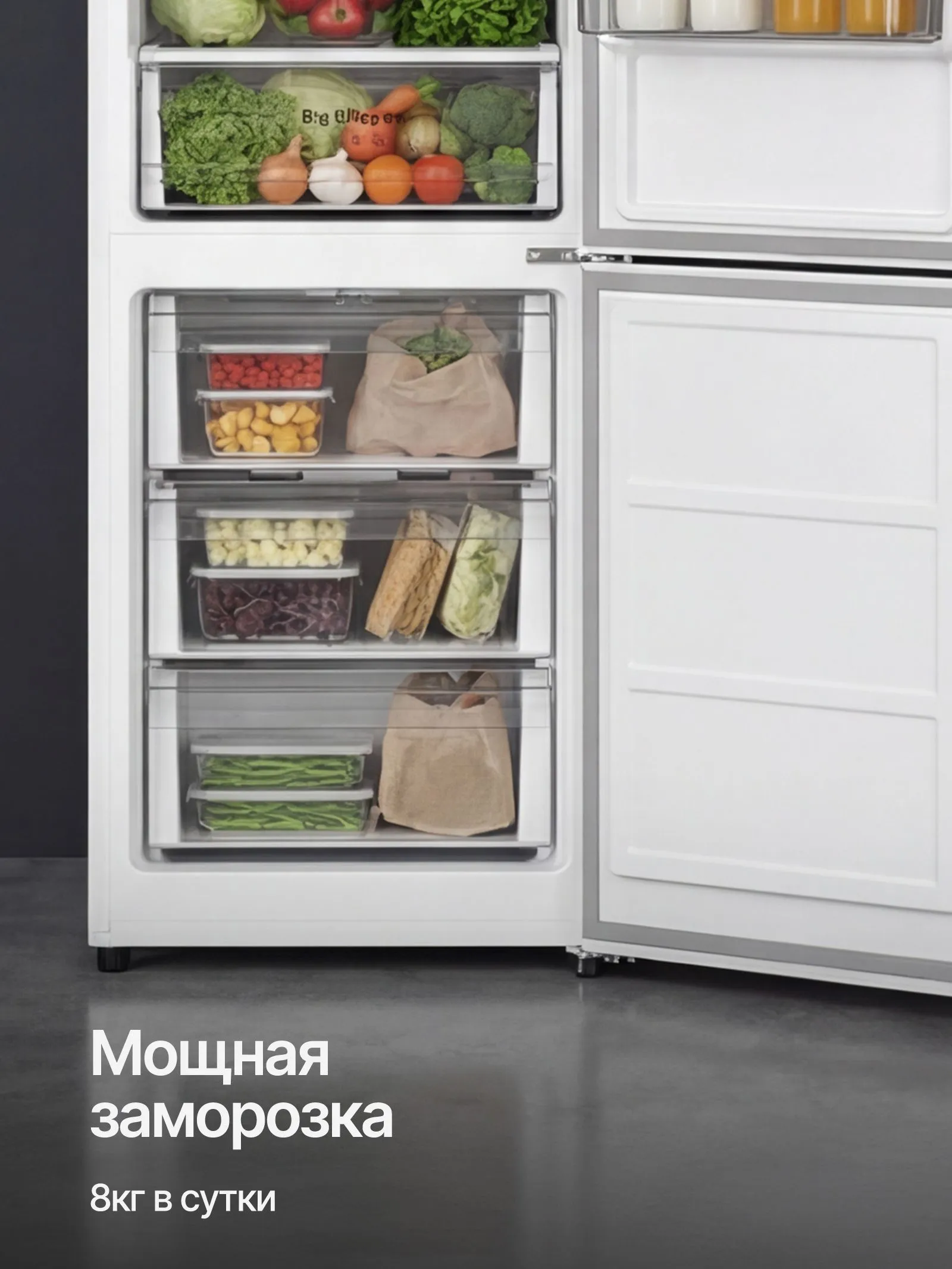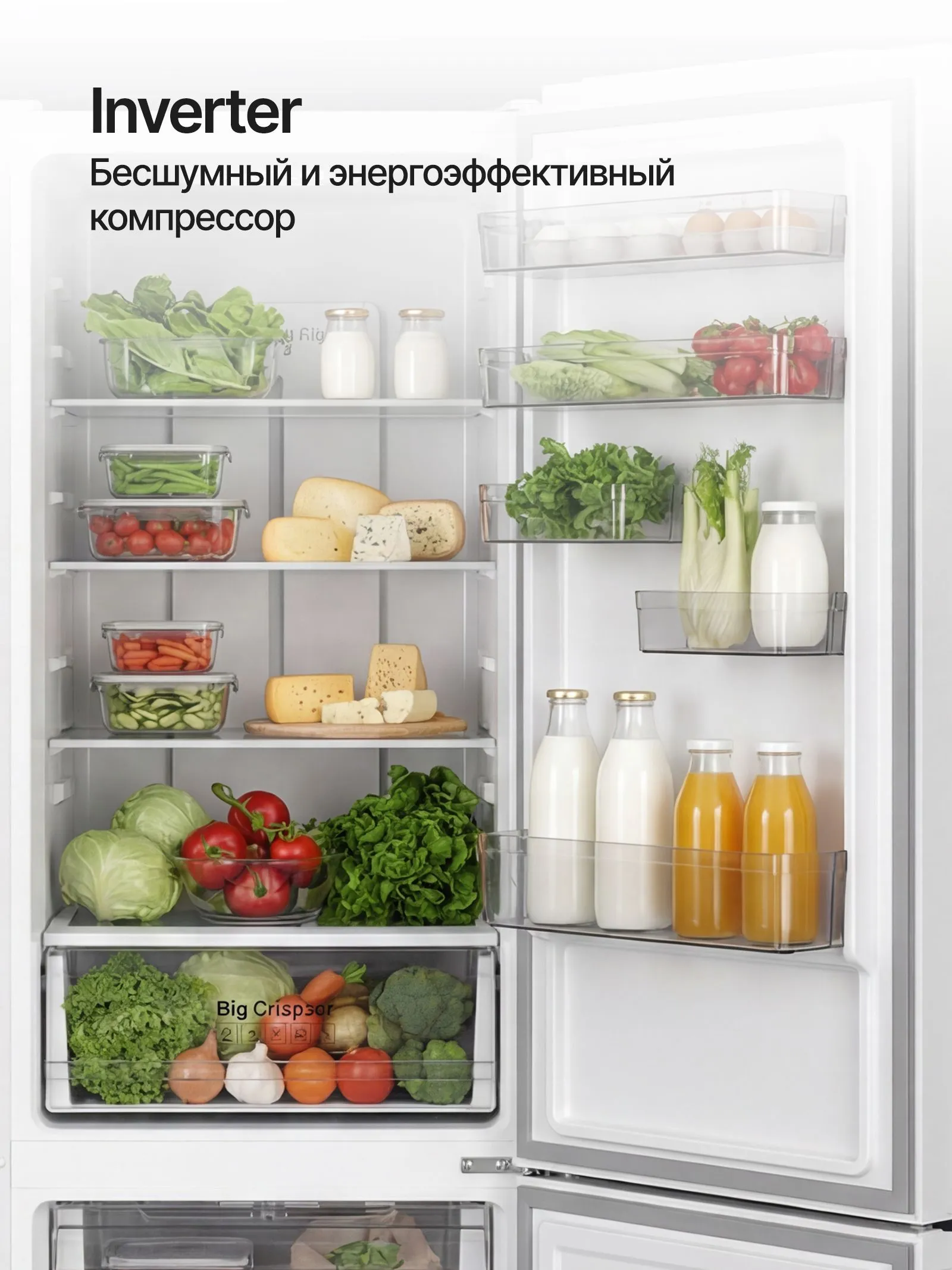 Kuppersberg RFCN 2015 W — это современный двухкамерный холодильник из коллекции High-Tech, выполненный в классическом белом цвете. Модель оснащена передовым инверторным компрессором, который обеспечивает тихую работу (40 дБ) и высокий класс энергоэффективности A++. Total No Frost: забудьте о разморозке Система Total No Frost полностью исключает образование инея и наледи на стенках обеих камер. Это позволяет поддерживать идеальный порядок и избавляет от необходимости ручного размораживания, сохраняя свежесть продуктов надолго. Объем 378 литров: пространство для хранения При высоте 195 см холодильник обладает внушительным общим объемом 378 литров. Холодильное отделение на 235 литров укомплектовано четырьмя стеклянными полками, три из которых регулируются по высоте, и пятью дверными балконами для удобной организации пространства. Морозильная камера: мощь и объем Нижний морозильный отсек полезным объемом 109 литров оснащен тремя вместительными выдвижными ящиками. Мощность замораживания составляет 8 кг в сутки, а функции «Супер заморозка» и «Супер охлаждение» позволяют быстро подготовить продукты к длительному хранению. Управление и режимы: интеллектуальный контроль Электронное управление с внешним LED-дисплеем позволяет точно настраивать параметры работы устройства. Специальный режим «Отпуск» оптимизирует энергопотребление во время вашего отсутствия, а звуковая индикация и хранение холода до 8 часов при отключении питания гарантируют сохранность продуктов. Продуманный дизайн: эргономика и свет Внутреннее пространство освещается современными светодиодами, которые обеспечивают отличную видимость на всех полках. Для гибкости планировки кухни предусмотрена возможность перенавешивания дверей, что позволяет адаптировать открывание холодильника под любое пространство.
