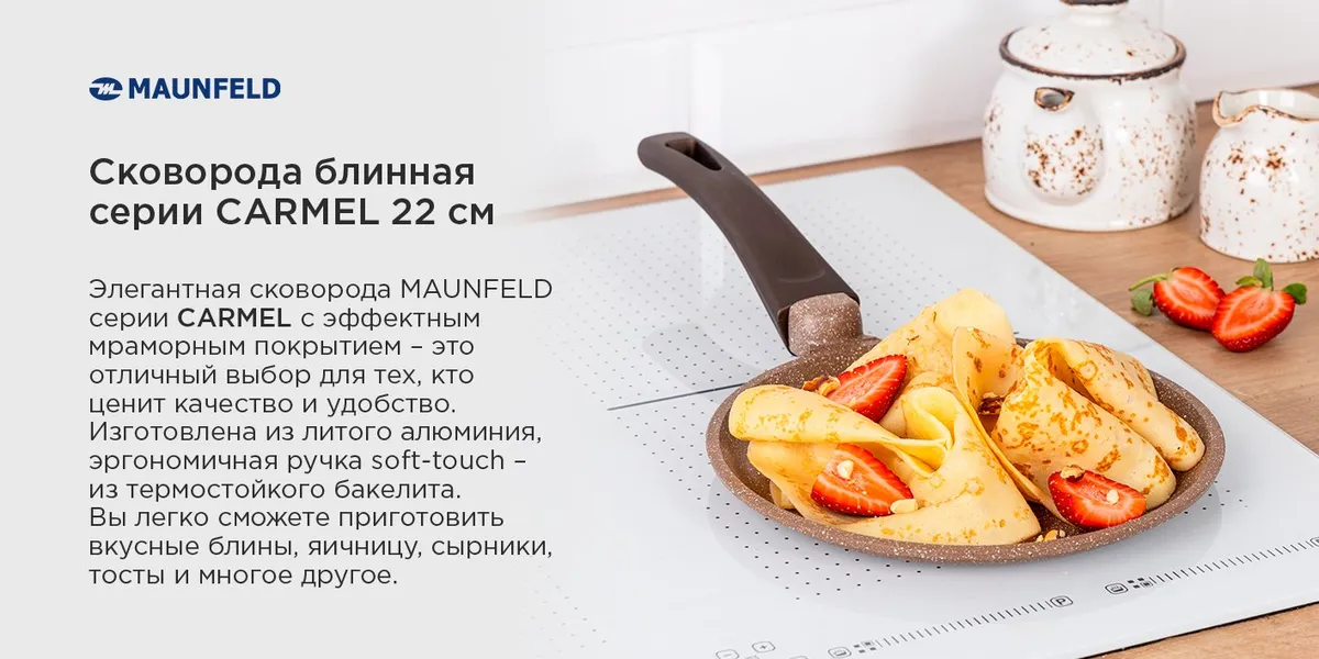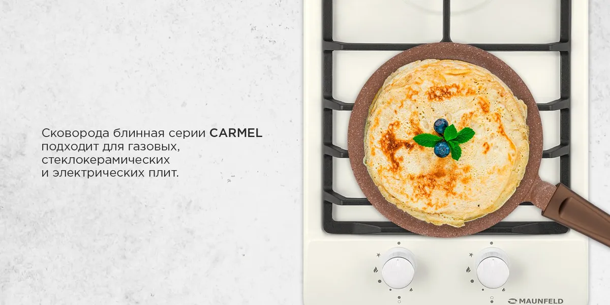 Сковорода блинная Maunfeld серии CARMEL - это отличный выбор для тех, кто ценит качество и удобство. Вы легко сможете приготовить вкусные блины, яичницу, сырники, тосты и многое другое.