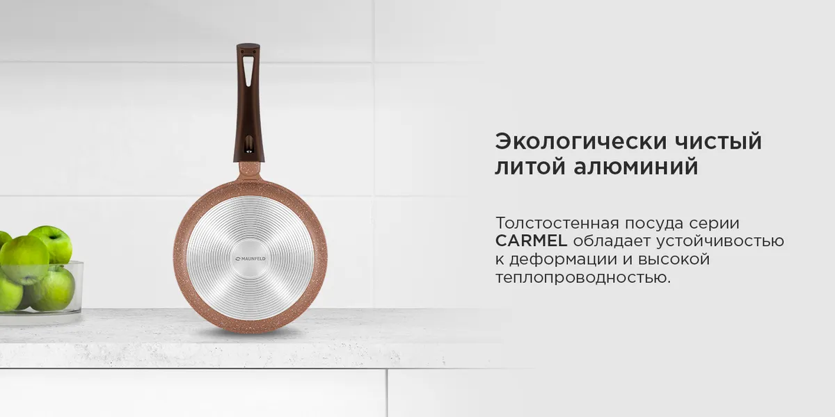 Сковорода блинная Maunfeld серии CARMEL изготовлена из литого алюминия, толстые стенки и дно обеспечивают высокую прочность и равномерное распределение тепла.