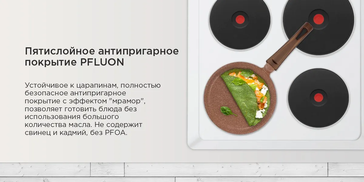 Пять слоев безопасного антипригарного покрытия не меняет вкус еды, можно готовить с небольшим количеством масла или готовить без масла, делая еду диетической - специально для поклонников здорового образа жизни. Сковорода с эффектным мраморным покрытием и современной ручкой в универсальном цвете, будет отлично сочетаться с любой кухней.