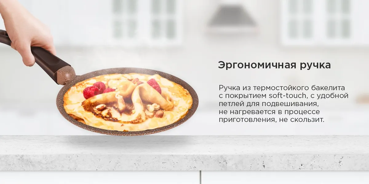 Эргономичная ручка из термостойкого бакелита с покрытием soft-touch не скользит в руке и не нагревается в процессе приготовления.