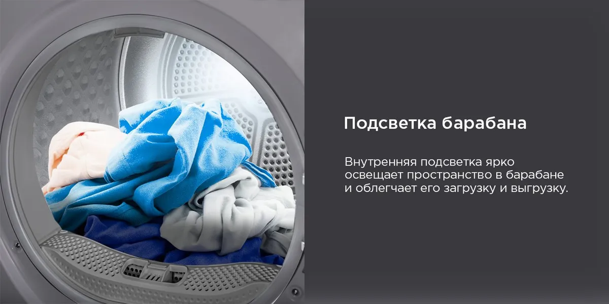 Внутренняя подсветка открывает возможность обзора всего внутреннего пространства камеры сушильной машины, что облегчает как загрузку и выгрузку вашей одежды, так и уход за техникой.