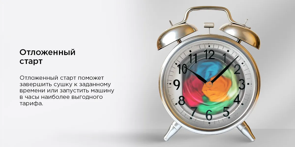 Функция «Отложенный старт» (до 24 часов) откроет вам возможность легко планировать свой день: если вам нужно завершить сушку к определенному времени или включить устройство в намеченные часы, то вы сможете с легкостью запрограммировать сушильную машину на включение в определенное время.