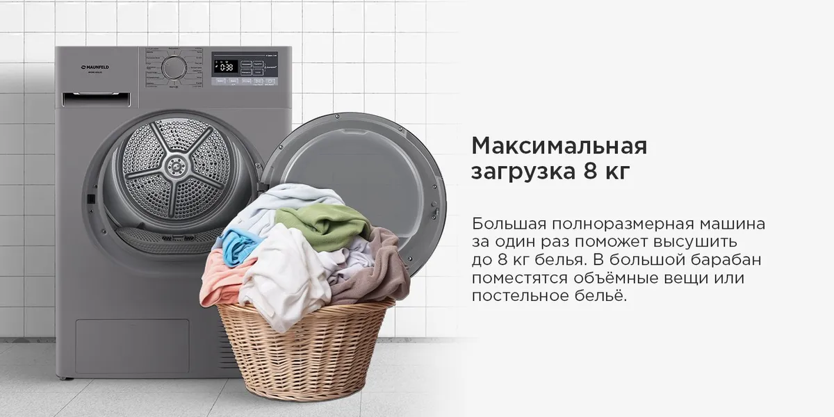 Загрузка белья до 8 кг в комбинации с внушительным объемом барабана дают вам возможность за один раз отправить все накопившееся белье в сушильную машину.