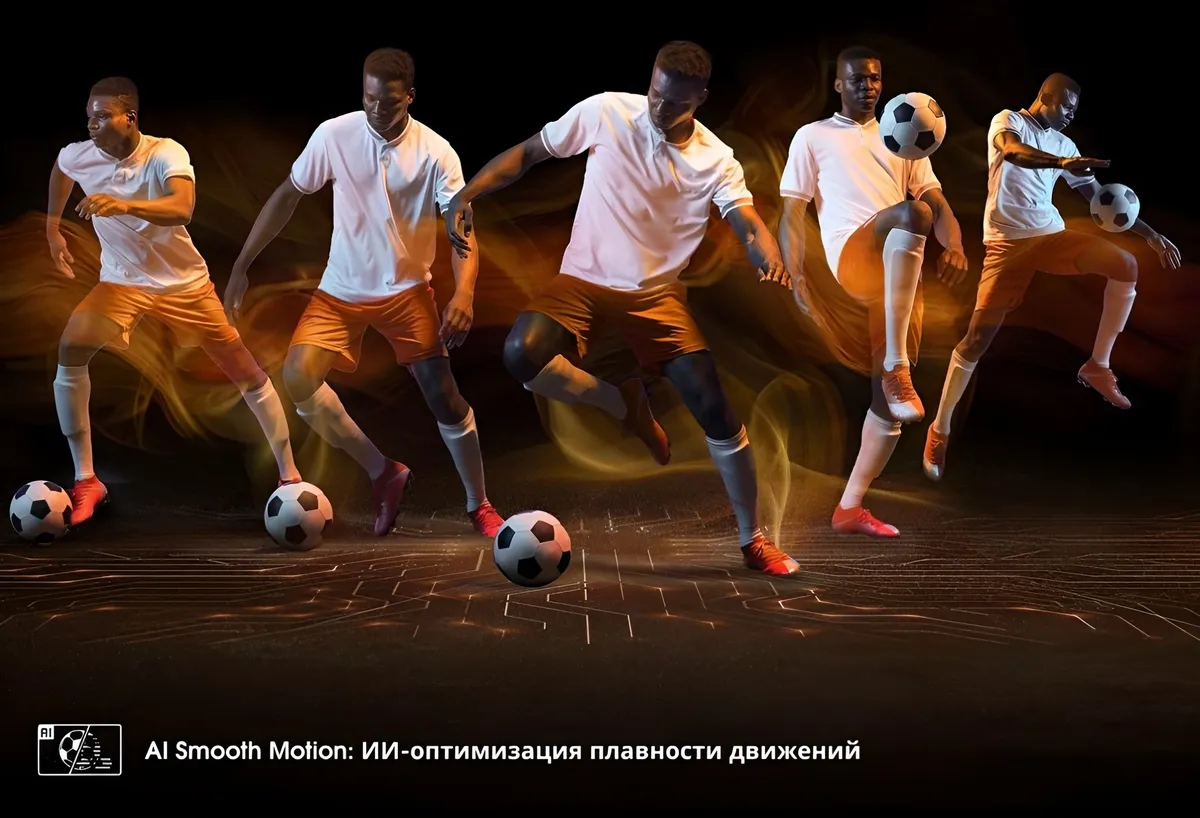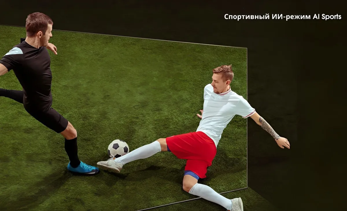 Болельщики могут расслабиться, пока спортивный ИИ-режим AI Sports автоматически распознает контент и оптимизирует настройки изображения и звука в режиме реального времени. Он улучшает текстуры, сглаживает движения и усиливает шум толпы для полного погружения в захватывающие события, позволяя почувствовать атмосферу стадиона, не выходя из дома.