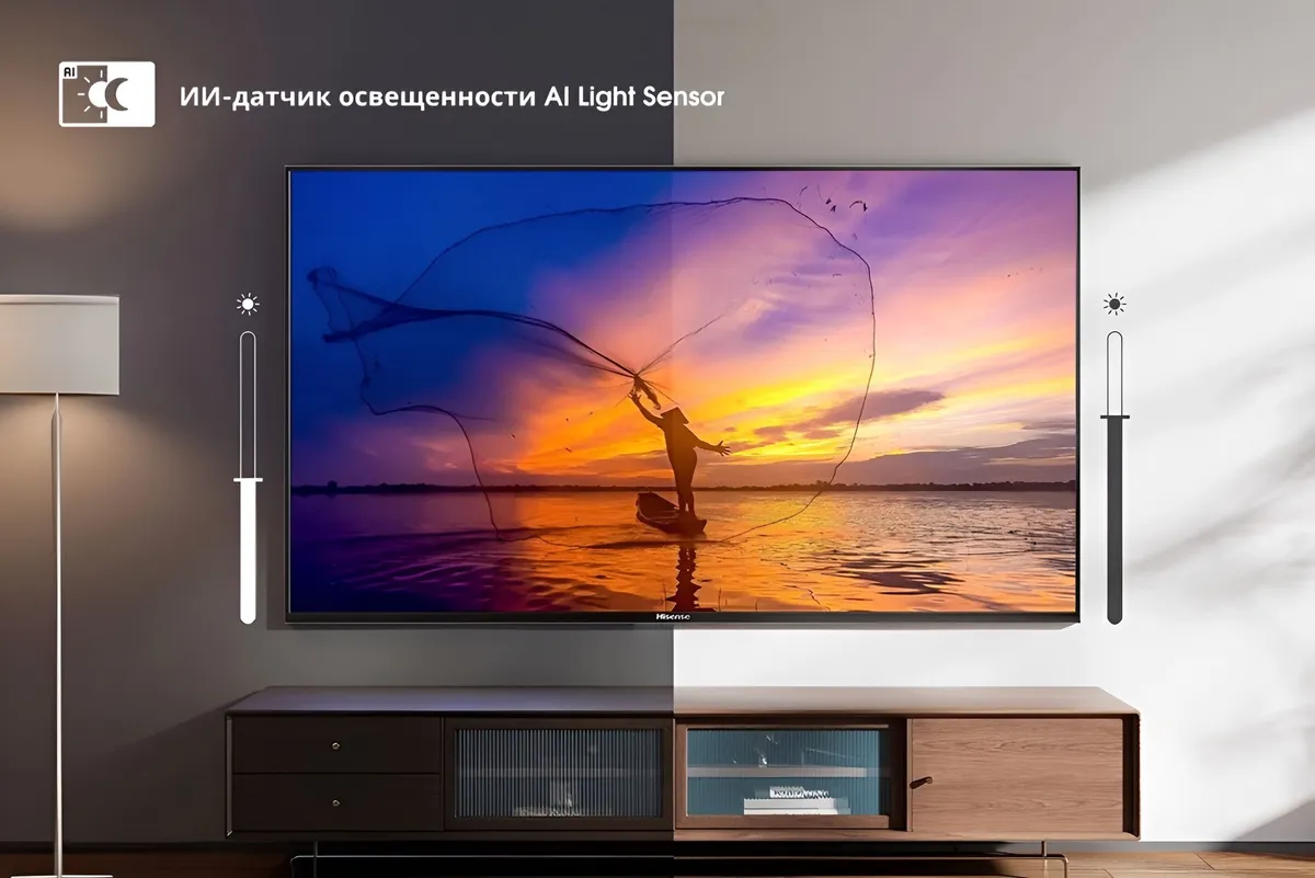 Автоматическая регулировка яркости для любой комнаты и любого времени суток. Датчик освещенности с ИИ регулирует подсветку в режиме реального времени в зависимости от окружающего освещения, поддерживая оптимальное качество изображения независимо от времени суток. Наслаждайтесь максимальной яркостью днем и комфортным просмотром ночью без необходимости ручной регулировки.