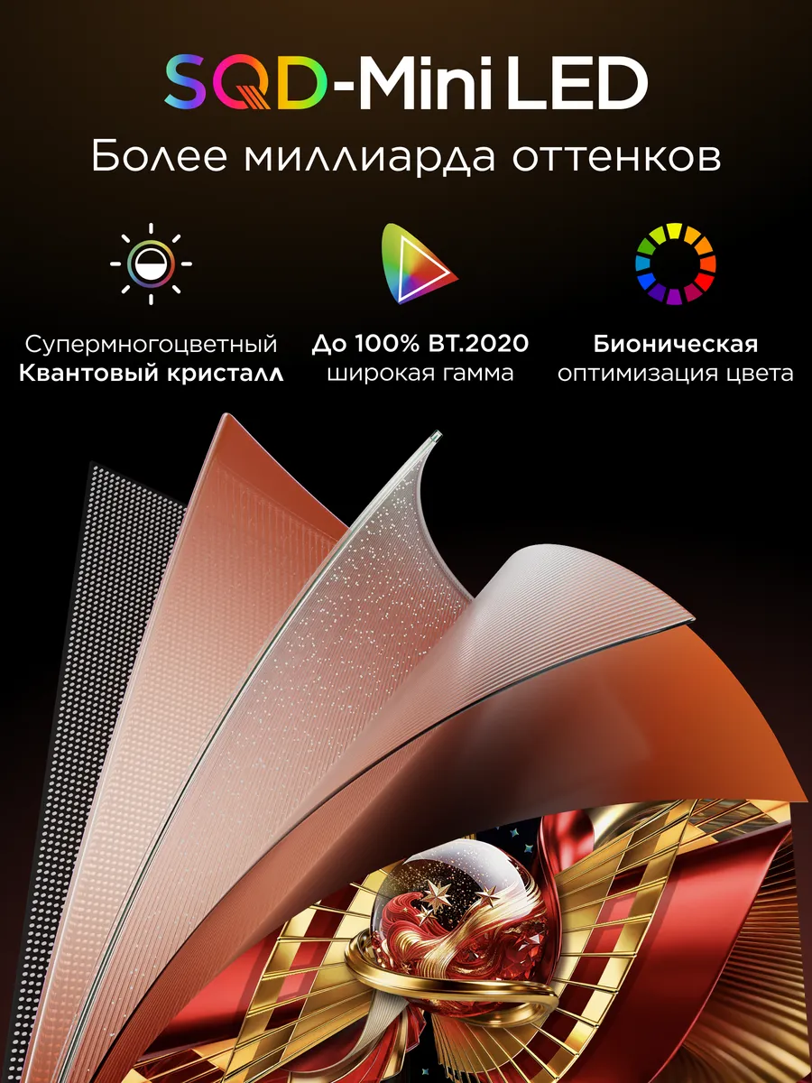 Телевизор TCL 55C8L SQD-Mini LED 4K HDR Google TV — это идеальный выбор для тех, кто ценит высокое качество изображения и умные функции. Модель с диагональю 55 дюймов и разрешением 4K UHD порадует вас невероятно реалистичной картинкой благодаря технологии SQD-Mini LED и поддержке HDR10+. Технология MEMC обеспечивает плавное воспроизведение динамичных сцен, а FreeSync Premium Pro гарантирует отсутствие разрывов изображения при игре. Звучание телевизора не оставит равнодушным никого: Dolby Atmos, Audio by Bang & Olufsen и DTS:X создают объемный и захватывающий звуковой опыт. Управление телевизором максимально удобно: в комплекте с пультом дистанционного управления идет голосовое управление, а также есть возможность управления со смартфона. Сmart TV на базе Google TV открывает доступ к огромному количеству приложений, фильмов, сериалов и игр. Подключение к интернету осуществляется через Wi-Fi 6 (802.11ax) для максимально быстрой и стабильной работы. Четыре порта HDMI и один USB порт позволяют подключить к телевизору все необходимые устройства. Телевизор TCL 55C8L SQD-Mini LED 4K HDR Google TV станет центром развлечений в вашем доме, обеспечивая незабываемые впечатления от просмотра фильмов, сериалов, спортивных трансляций и игр.