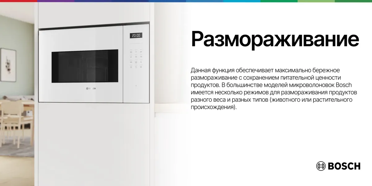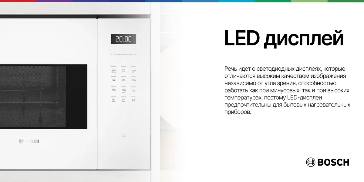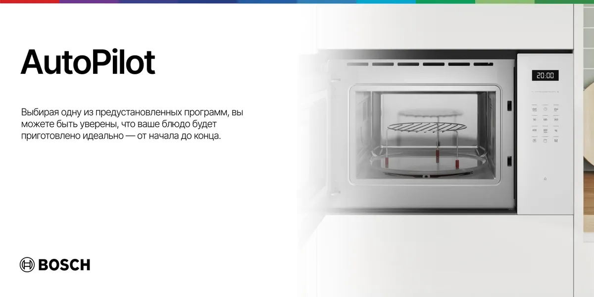 Встраиваемая микроволновая печь Bosch BEL554MW2 оснащена сенсорным управлением TouchControl и LED-дисплем: комбинация точного ввода и информативного отображения делает эксплуатацию интуитивной даже для пользователей без опыта. Наличие часов и таймера позволяет точно контролировать время приготовления, а кнопка Старт/Стоп и функция автоматического защитного отключения добавляют удобства и гарантируют безопасность при эксплуатации. Электронная система поддерживает сохранение пользовательских рецептов, что экономит время на повторяющихся блюдах: достаточно задать параметры один раз, и устройство запомнит последовательность действий. Функция AutoPilot включает ряд автоматических алгоритмов для популярных блюд, а восемь программ и четыре режима размораживания дают гибкость при работе с разными продуктами — от мягкого оттаивания морепродуктов до более интенсивной подготовки мяса перед запеканием.